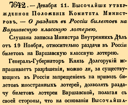 23 декабря (11 декабря по ст.ст.) 1834 года. Царствование Императора Николая IО раздаче в России билетов на Варшавскую классную лотерею.Слушана записка Министра Внутренних дел от 19 ноября, относительно раздачи в России билетов на Варшавскую классную лотерею.Генерал-Губернатор Князь Долгорукий испрашивает разрешения, можно ли, за существующим в России запрещением на привоз билетов иностранных лотерей, дозволять раздачу билетов лотереи Варшавской, полагая со своей стороны, что на основании Высочайшего Манифеста 14 Февраля 1832 года Царства Польского нельзя считать иностранным Государством.Министр Внутренних Дел отвечал на сие, что как означенная лотерея учреждена с Высочайшего соизволения, то раздача билетов не требует особого разрешения. Но усмотрев в последствии из объявлений о сделанном по Таможенному ведомству распоряжении, чтобы в случае задержания иностранных лотерейных билетов, кои указом 23 Марта 1771 года воспрещено брать Рос