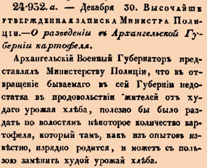 Архангельскій Военный Губернаторъ представлялъ Министерству Полиціи, что въ отвращеніе бываемаго въ сей Губерніи недос статка въ продовольствіи жителей отъ худаго урожая хлѣба, полезно бы было раздать по волостямъ нѣкоторое количество картофеля, который тамъ, какъ изъ опытовъ извѣстно, изрядно родится, и можетъ съ пользою замѣнить худой урожай хлѣба.
