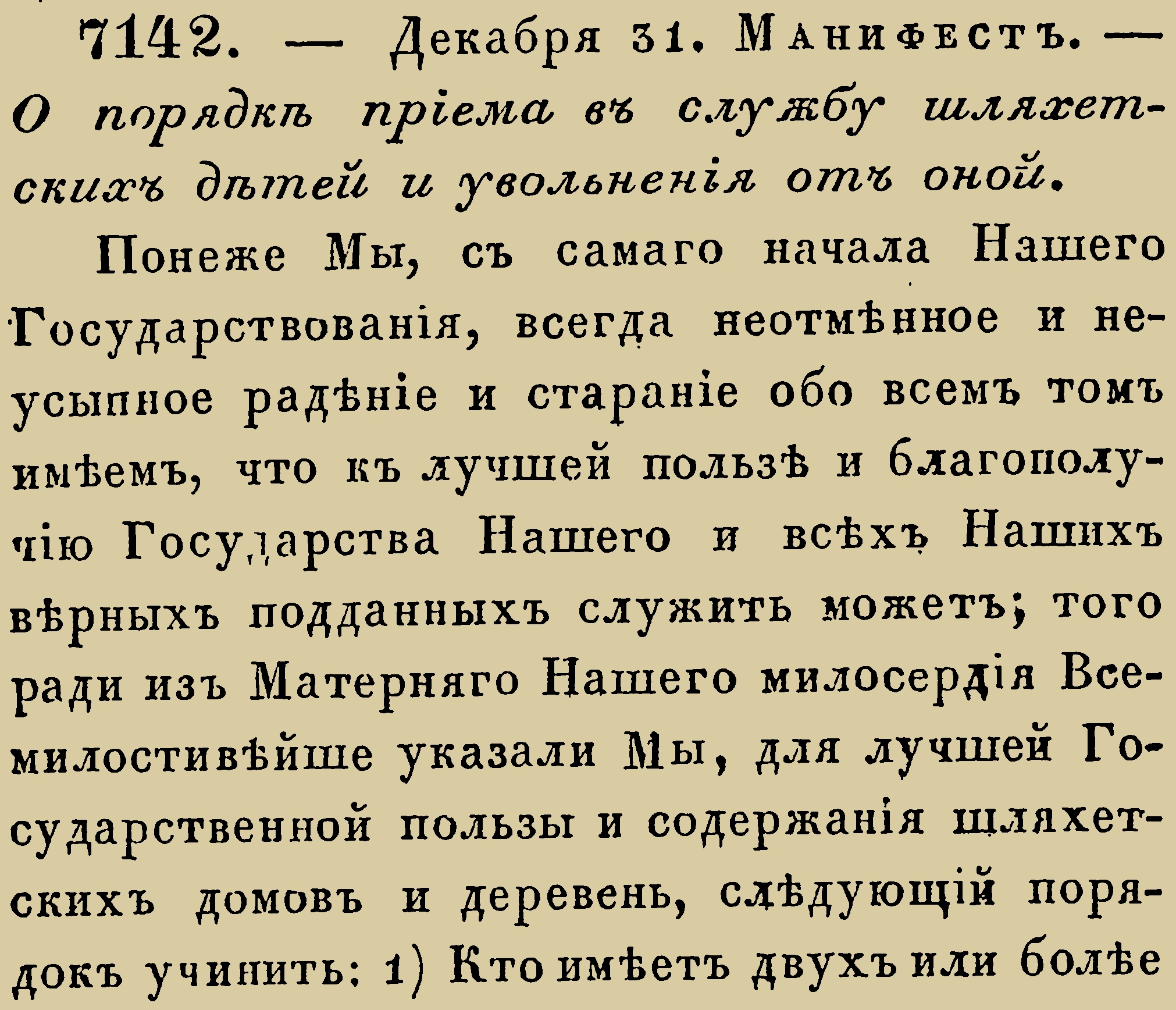 Понеже Мы, съ самаго начала Нашего Государствованія, всегда неотмѣнное и неусыпное радѣніе и стараніе обо всемъ томъ имѣемъ, что къ лучшей пользѣ и благополучію Государства Нашего и всѣхъ Нашихъ вѣрныхъ подданныхъ служить можетъ; того ради изъ Матерняго Нашего милосердія Всемилостивѣйше указали Мы, для лучшей Государственной пользы и содержанія шляхетскихъ домовъ и деревень, слѣдующій порядокъ учинить: 1) Кто имѣетъ двухъ или болѣе сыновей, изъ оныхъ одному, кому отецъ заблагоразсудитъ, остаться въ домѣ для содержанія экономіи, также которые братья родные два или три, не имѣя родителей, пожелаютъ оставить въ домѣ своемъ для смотрѣнія деревень и экономіи, кого изъ себя одного, въ томъ давать имъ на волю; но чтобъ тѣ оставшіе въ домахъ довольно грамотѣ, и по послѣдней мѣрѣ Ариѳметикѣ, обучены были, дабы оные въ гражданской службѣ годны были. 2) Прочіе всѣ братья, сколь скоро къ воинской службѣ будутъ годны, должны вступить въ военную службу. Но понеже какое время быть въ воинской службѣ, по сіе время опредѣленія было не учинено, и отставляются весьма старые и дряхлые, которые, приѣхавъ въ свои домы, экономію домашнюю какъ надлежитъ смотрѣть, уже въ состояніи не находятся; и для того всѣмъ шляхтичамъ, отъ 7 до 20 лѣтъ возраста ихъ, быть въ наукахъ, а отъ 20 лѣтъ употреблять въ воинскую службу, и всякой долженъ служить воинской службѣ, отъ 20 лѣтъ возраста своего, 25 лѣтъ; а по прошествіи 25 лѣтъ, всѣхъ, хотя кто еще и въ службу былъ годенъ, отъ воинской и статской службы отставлять съ повышеніемъ одного ранга и отпущать въ домы; а кто изъ нихъ добровольно больше служить пожелаютъ, такимъ давать на ихъ волю. 3) Которые шляхтичи, за имѣющимися у нихъ болѣзньми или раны, по свидѣтельствамъ явятся къ службѣ неспособны, оные могутъ быть отставлены и отпущены въ домы свои и до урочныхъ лѣтъ. 4) Отъ тѣхъ, которые вышеписаннымъ образомъ въ домахъ своихъ останутся, и въ военной службѣ употреблены не будутъ, со всѣхъ тѣхъ брать, вмѣсто ихъ, рекрутъ, изъ ихъ собственныхъ крѣпостныхъ людей, годныхъ въ службу, за кѣмъ меньше ста душъ, по одному; а за которымъ больше того, съ такихъ, считая съ каждаго ста душъ, сколько бъ сотъ или тысячъ душъ ни было, по одному жъ человѣку. 5) А которые, выслужа при арміи и полкахъ вышеписанные урочные годы, пожелаютъ въ домы свои, таковыхъ отпущать съ повышеніемъ одного ранга, токмо при отпускѣ изъ службы брать у нихъ въ службу изъ ихъ собственныхъ людей, за кѣмъ 100 душъ и меньше, по одному, а съ такихъ, за которыми великія деревни, съ каждаго жъ 100 душъ по человѣку. 6) Такимъ же образомъ, какъ выше сего означено, поступать и съ штатскими чинами, которые свои деревни имѣютъ. А понеже нынѣ съ Турками война, и для того отставку по вышеписанному въ урочныя лѣта чинить, II по окончаніи той Турецкой войны.