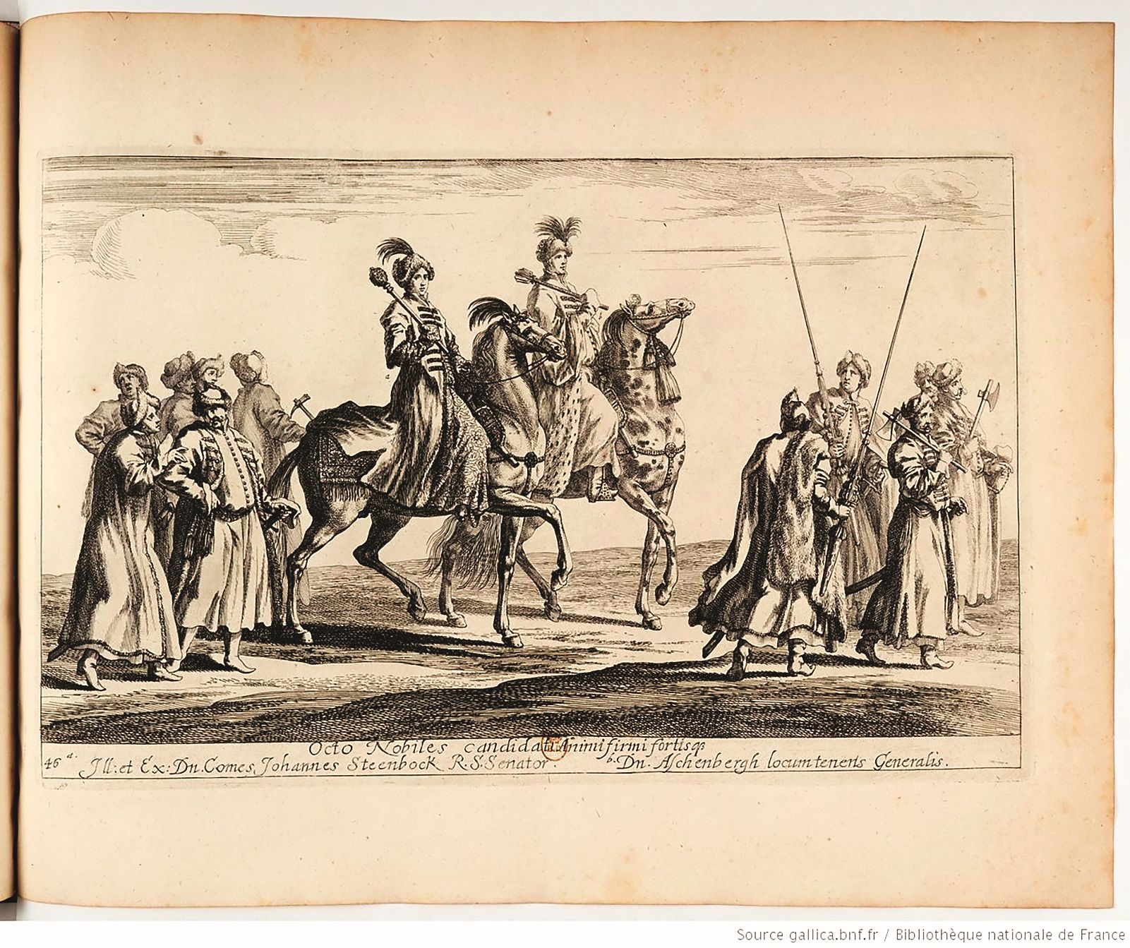Вельможи в уборах польских военачальников со свитой на торжественной «карусели», посвященной совершеннолетию Карла XI в 1672 г.