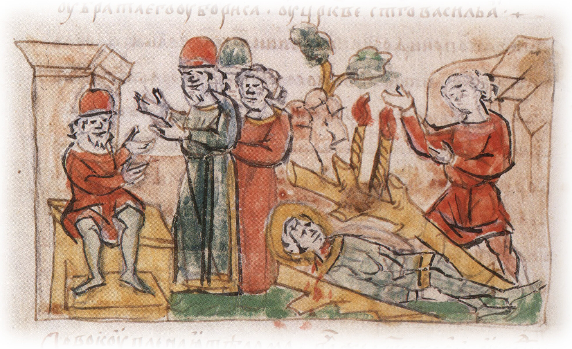 Возвращение убийц Глеба Владимировича к Святополку Владимировичу с донесением о выполнении его повеления; обнаружение тела Глеба, брошенного убийцами на берегу.