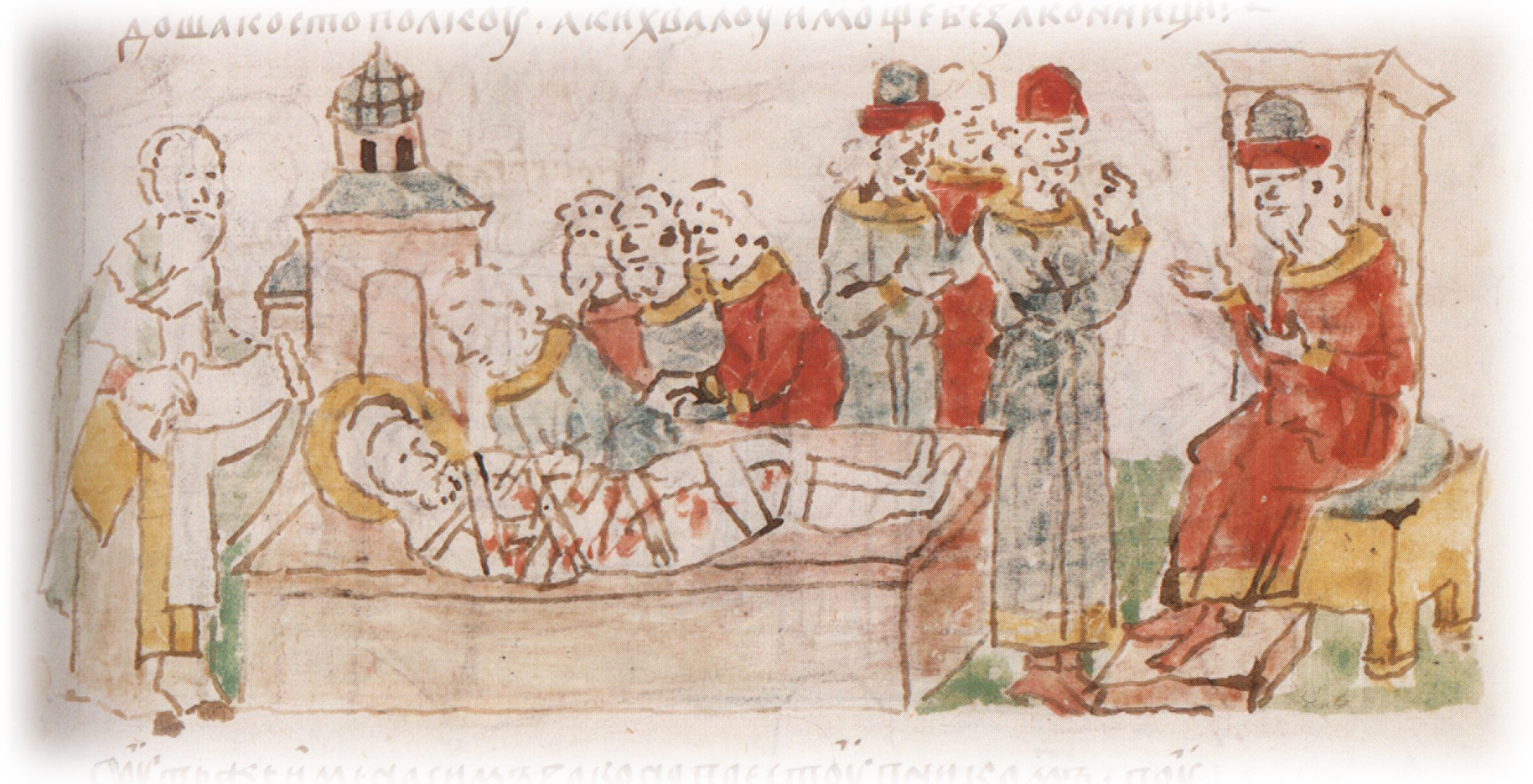 Привоз тела убитого Бориса Владимировича к церкви святого Василия в Вышгороде; приход к Святополку Владимировичу убийц Бориса — Путши и других.