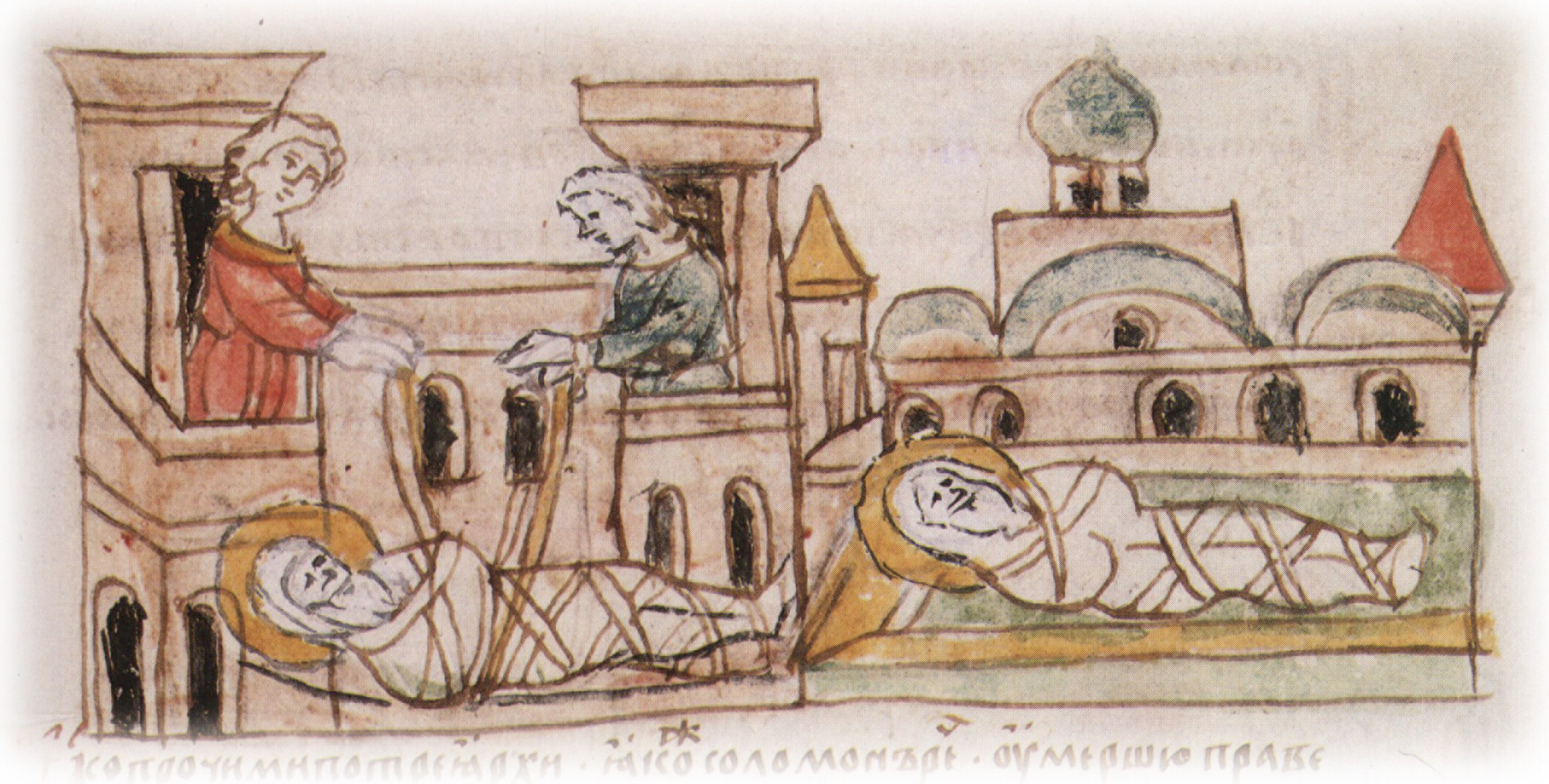 Тайное погребение Владимира Святославича, умершего в Берестове: спуск его тела на землю на ковре между разобранными клетьми здания; положение тела Владимира в мраморный гроб в церкви Святой Богородицы.
