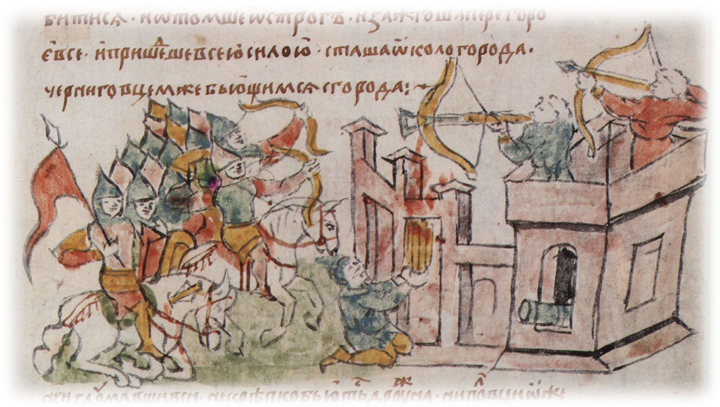 "На утрий же день Гургий и Святослав исполчиша воя своя и поидоша к городу... и ото-мше острог, и зажгоша передгородье все, ...черниговцем же бьющимся с города".