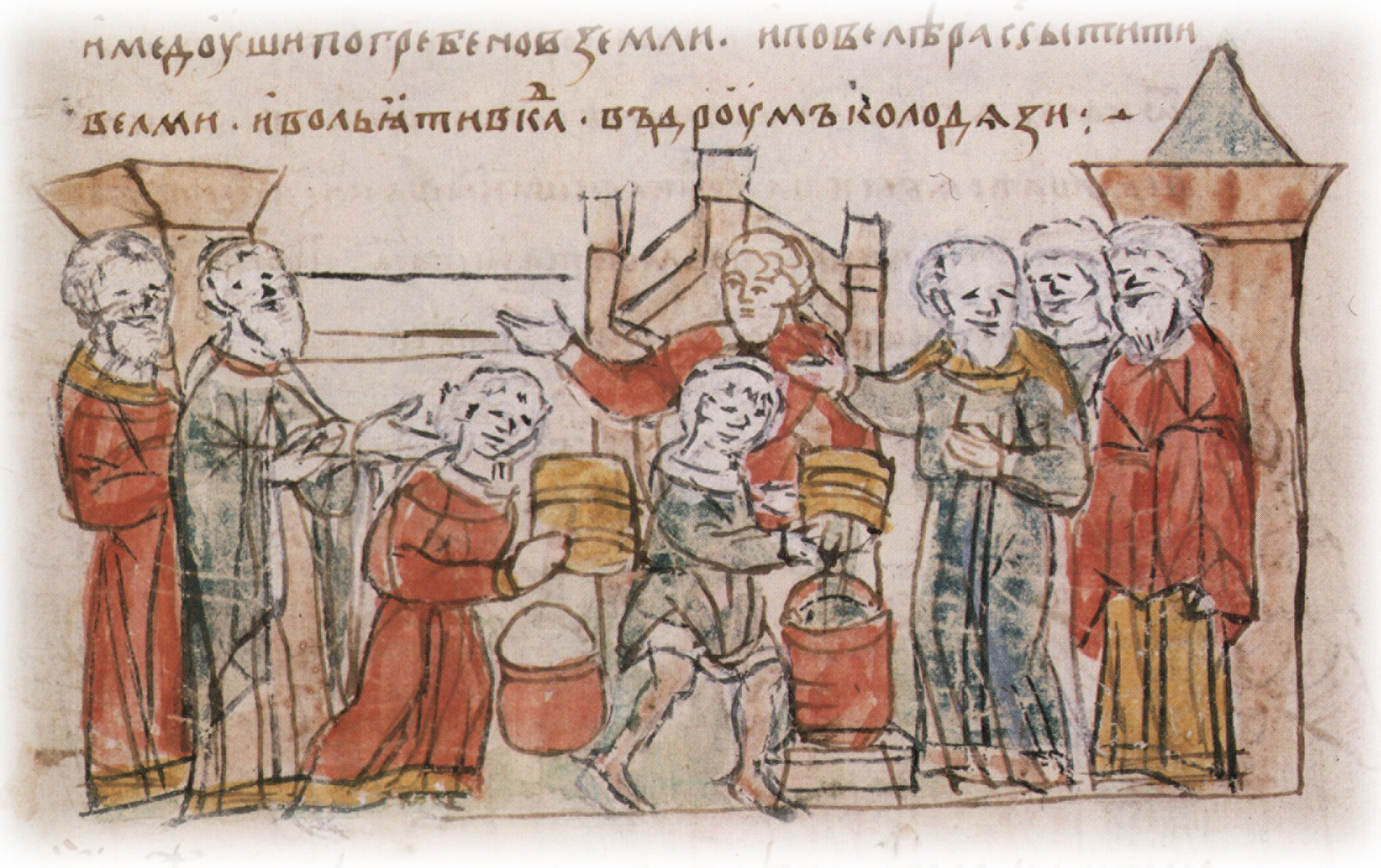 "И повеле женам сотворити цежа, в нем же варять кисель. И повеле ископати колодязь, и нальати цежа кадь. И повеле другый колодязь ископати, и въетавити другую кадь. И повеле искати мед... И повеле... вольяти в кадь в друзем колодязи".
