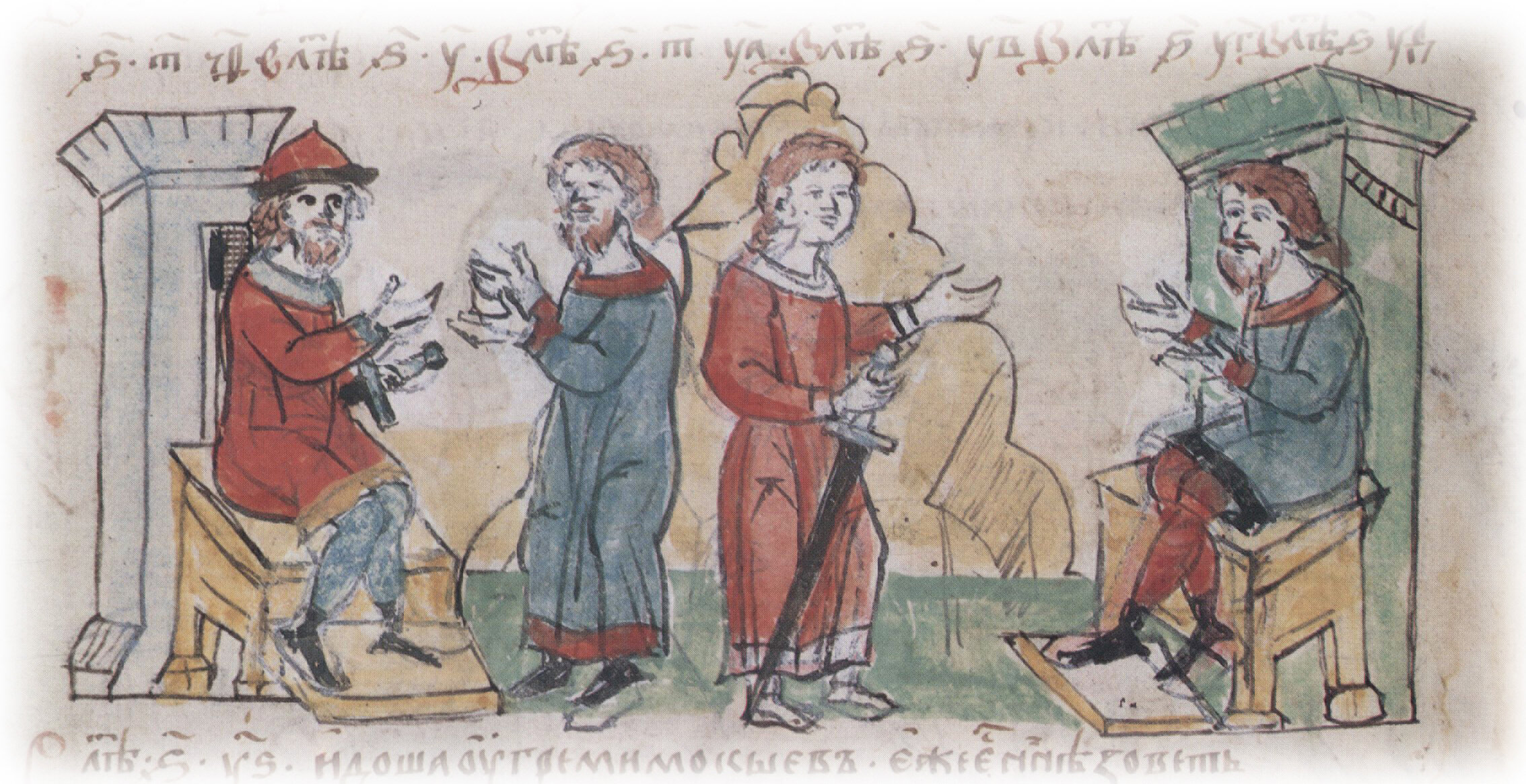 Тайное погребение Владимира Святославича, умершего в Берестове: спуск его тела на землю на ковре между разобранными клетьми здания; положение тела Владимира в мраморный гроб в церкви Святой Богородицы.