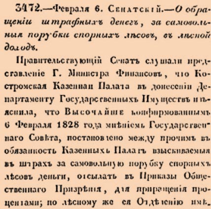 3472. 1830 год. 18 февраля (6 февраля ст.ст.) Сенатский. О обращении штрафных денег, за самовольныя порубки спорных лесов, в лесной доход.Правительствующий Сенат слушали представление Г.Министра Финаносв, что Костромская Казенная Палата в донесение Департаменту Государственных Имуществ изъяснила, что Высочайше конфирмованным 6 Февраля 1828 года мнением Государственнаго Совета постановлено между прочим в обязанность Казенных Палат взыскиваемыя в штрах за самовольную порубку спорных лесов деньги, отсылать в Приказы Общественнаго Призрения <…>