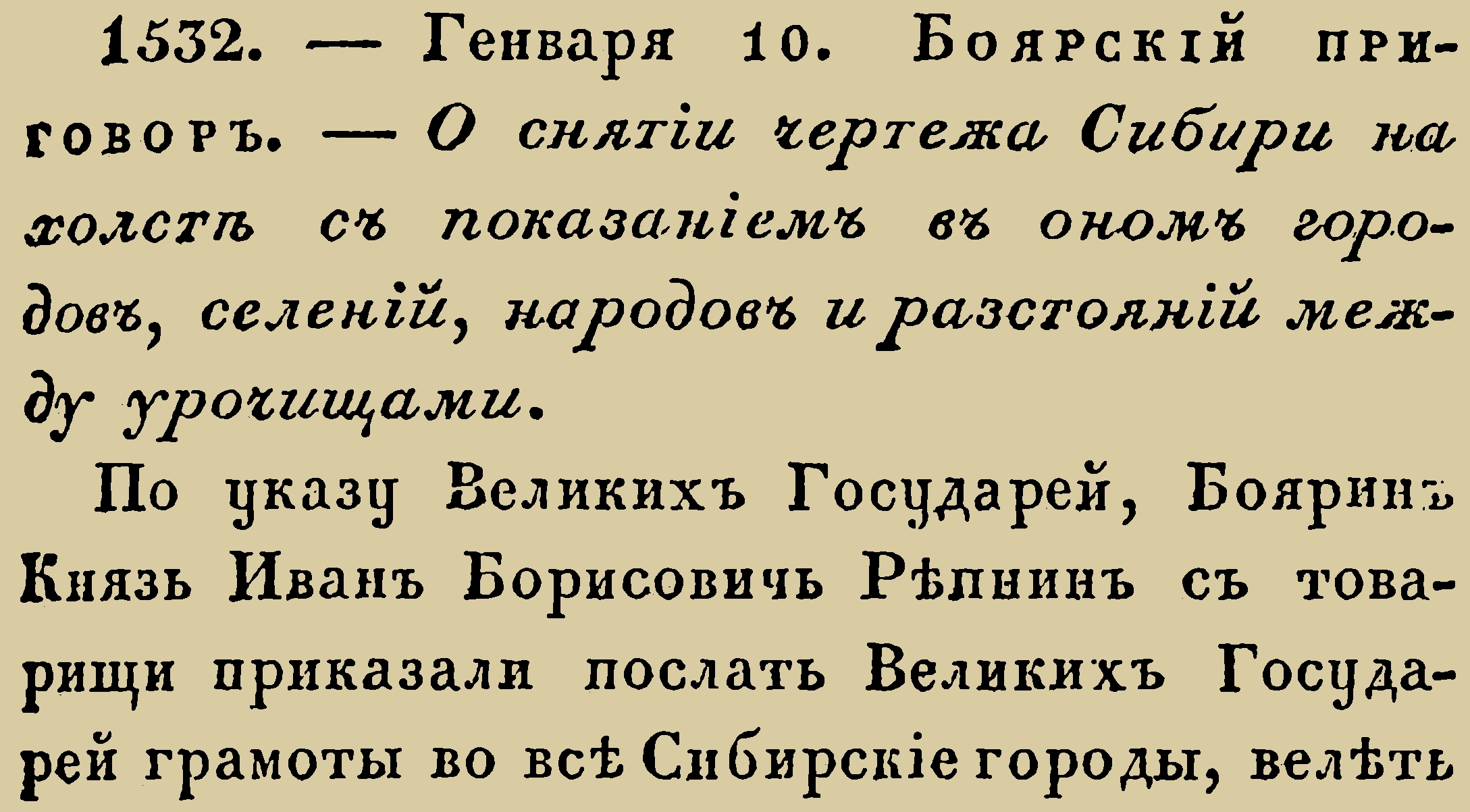 Закон № 1532.- 7204 (1696) год, 10 января (20 января). Распоряжение Боярской думы о составлении подробных географических карт Сибири и ее административных единиц на холсте.