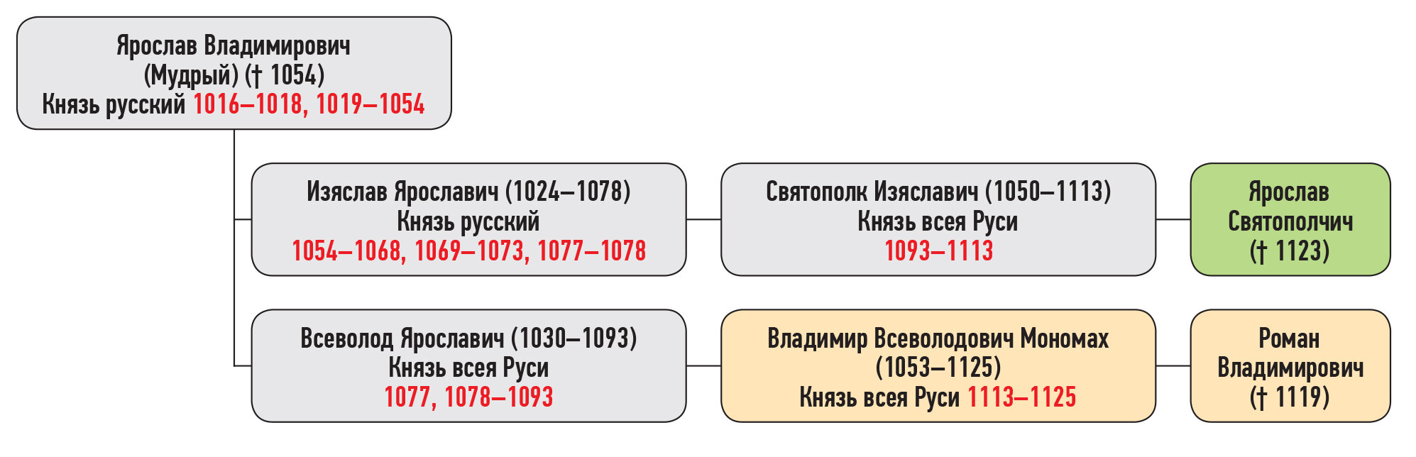 Владимир Мономах — сын Всеволода Ярославича, Ярослав Святополчич — сын Святополка Изяславича, Роман Владимирович — сын Владимира Мономаха Святополк