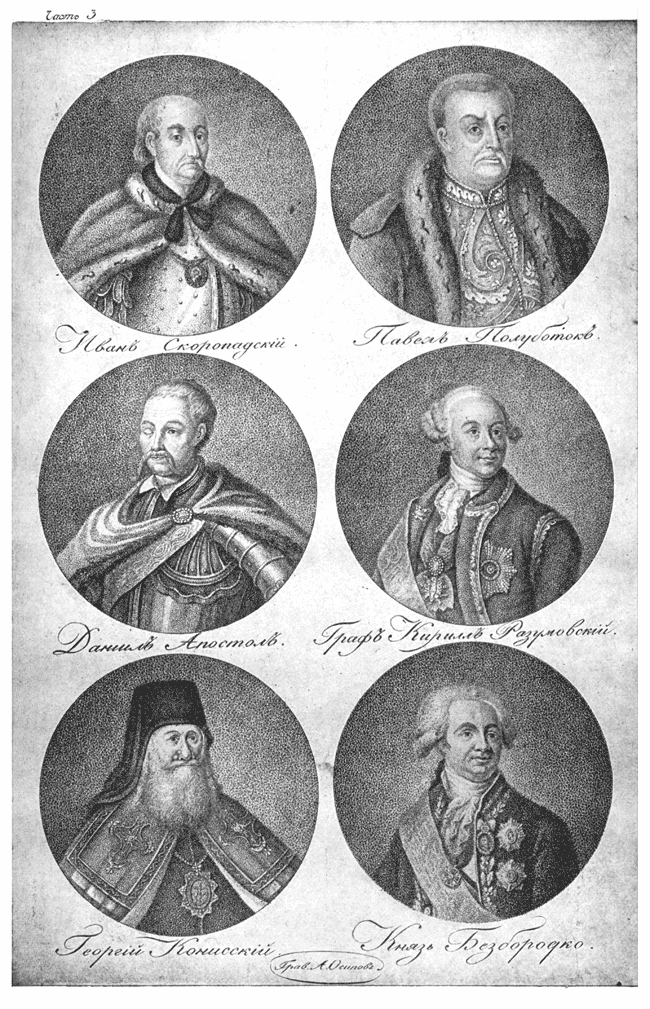 Портреты: Иван Скоропадский, Павел Полуботок, Данеил Апостол, граф Кирилл Разумовский, Георгий Конисский, князь Безбородко.