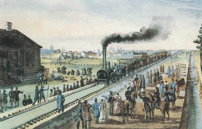 Прибытие поезда на станцию Царскосельской железной дороги. Рисунок 19 века.