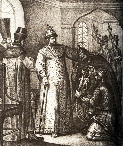 Царю Ивану Грозному вручают военные трофеи. Гравюра Б.А. Чорикова. Середина XIX века