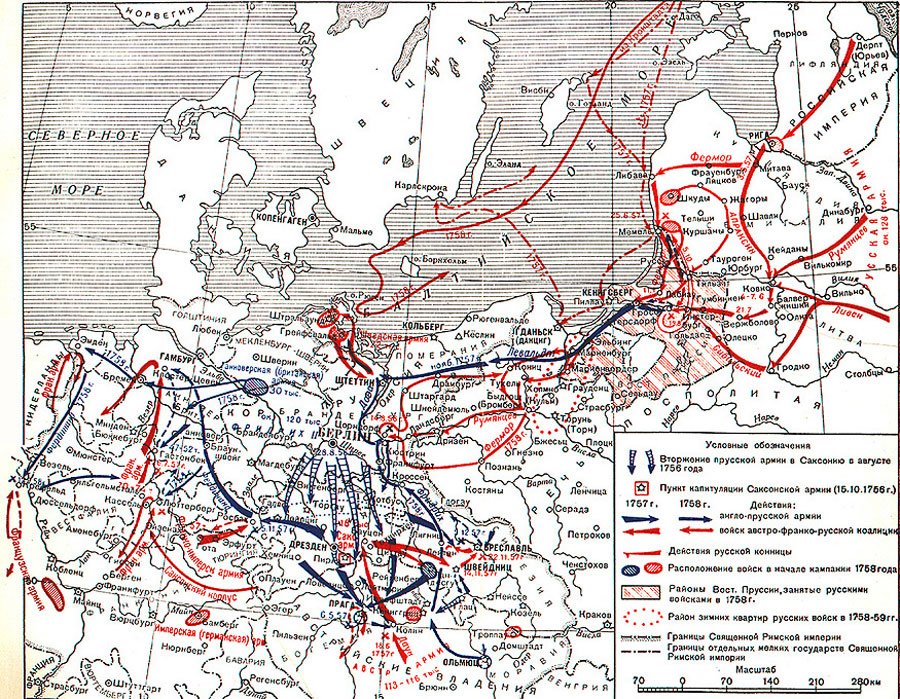 В первый день января 1758 года колонны Салтыкова и Румянцева (30000) перешли границу. 11-го января занят Кенигсберг, а вслед затем и вся Восточная Пруссия, обращенная в русское генерал-губернаторство. Мы приобретали ценную базу для дальнейших операций и, собственно говоря, достигли поставленной нами цели войны...