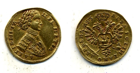 10 рублей золотом с профилем Петра. 1706 год