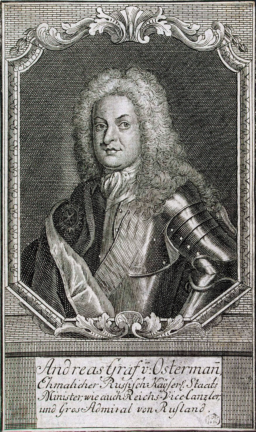 Остерман Андрей (Генрих Иоганн Фридрих) Иванович (1686 – 1747), российский государственный деятель, дипломат, граф (1730). Родился в Вестфалии, на российской службе с 1703. Член Верховного тайного совета (1726—1730). Фактический руководитель внутренней и внешней политики России при Анне Иоанновне. В 1741 сослан Елизаветой Петровной в Берёзов, где и скончался.