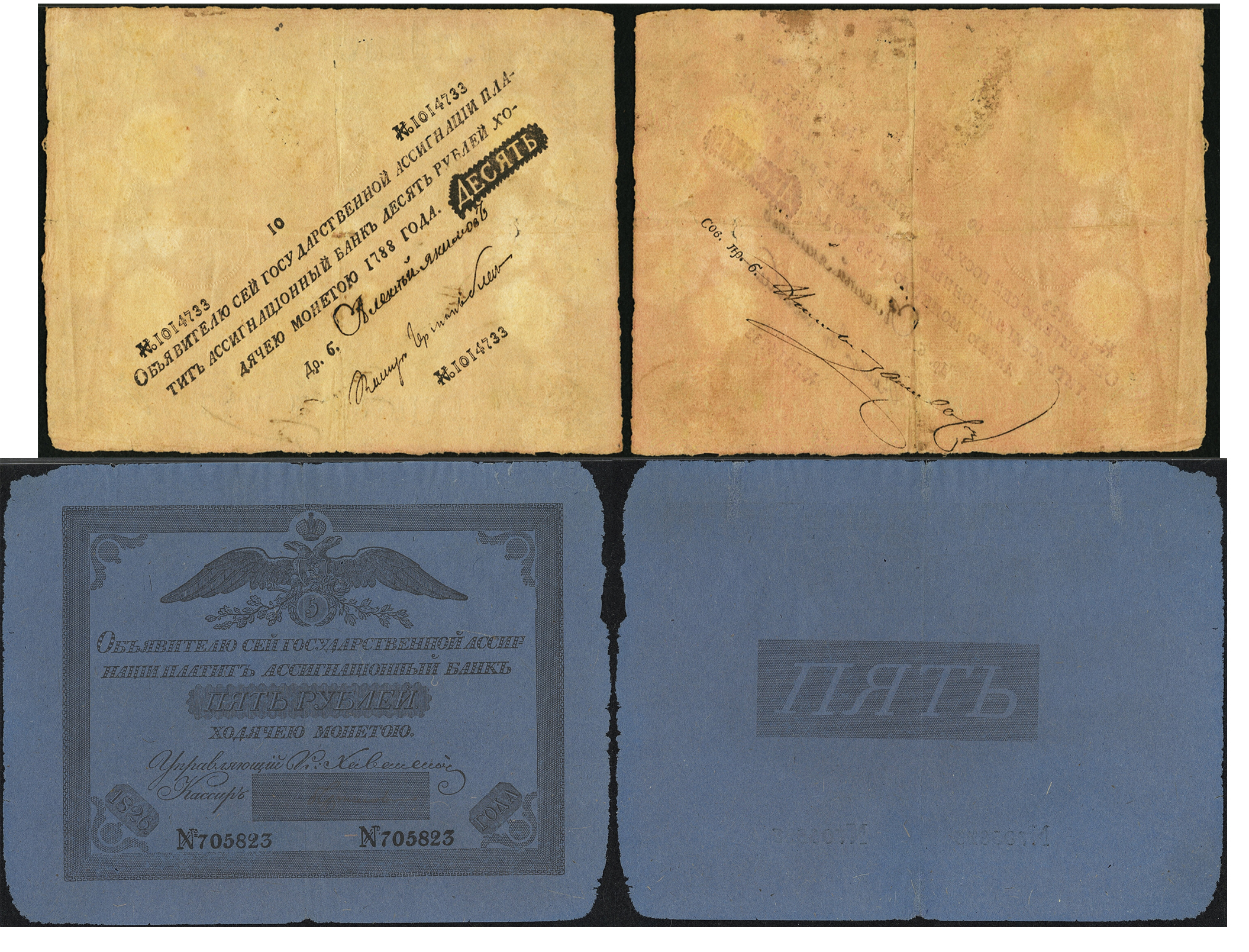 1788 г. ассигнат 10 рублей, 170 × 130 мм, $33,6 тыс., 2018 г., Heritage.