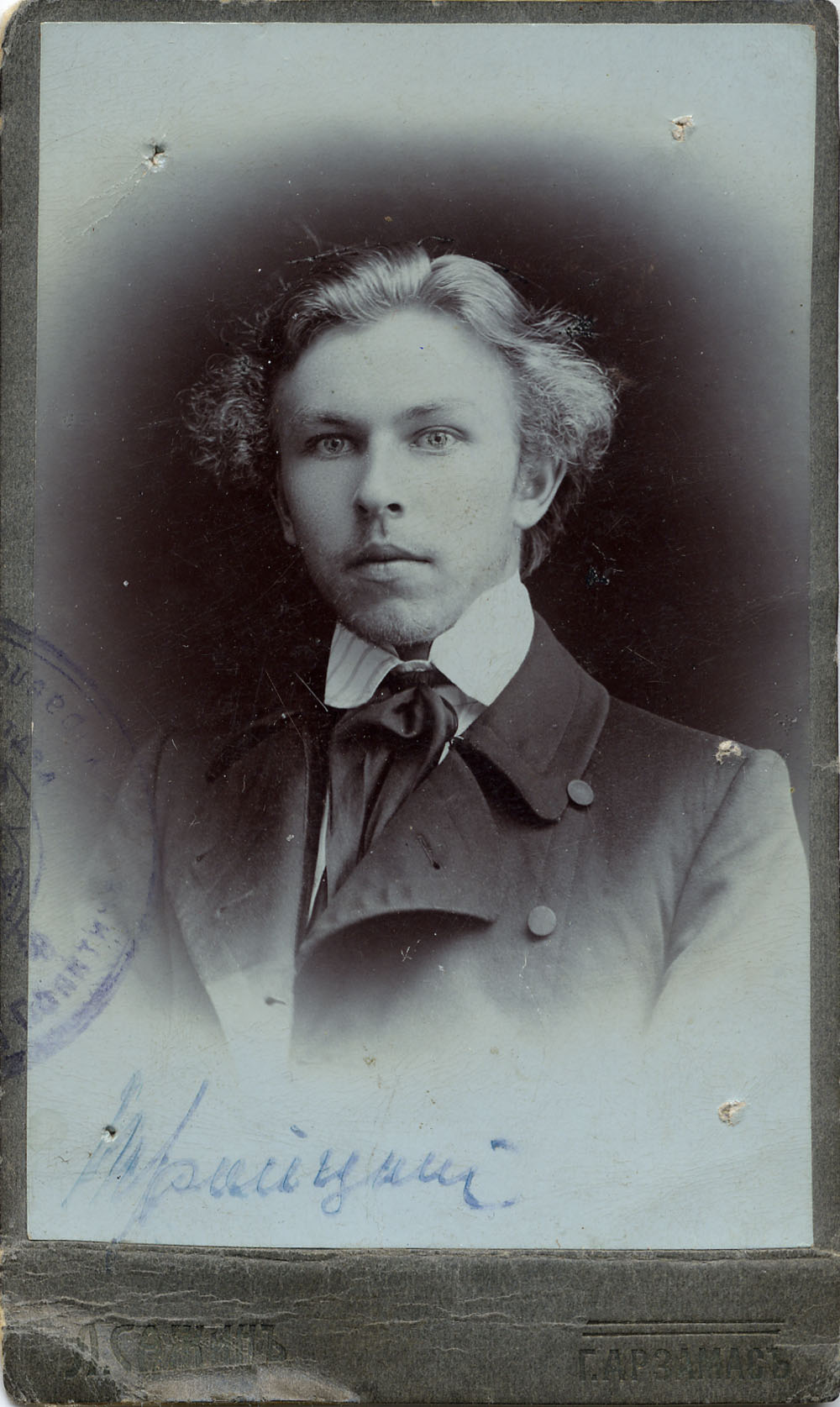 Портрет Александра Ростоцкого. На обороте надпись: “Дорогому и незабвенному Папаше на добрую память от Сына Александра Ростоцкого. 10 апреля 1896 года”. Москва.