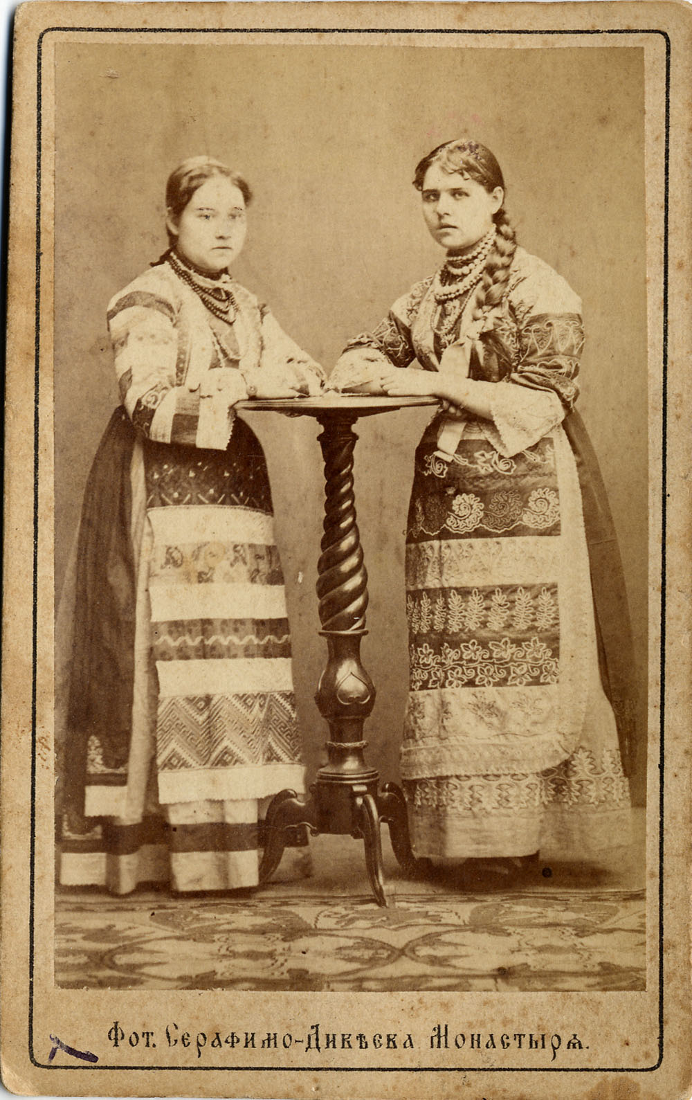 «Фот. Серафимо-Дивъева монастыря». Портрет двух девушек в русских национальных костюмах. 1900-е г.