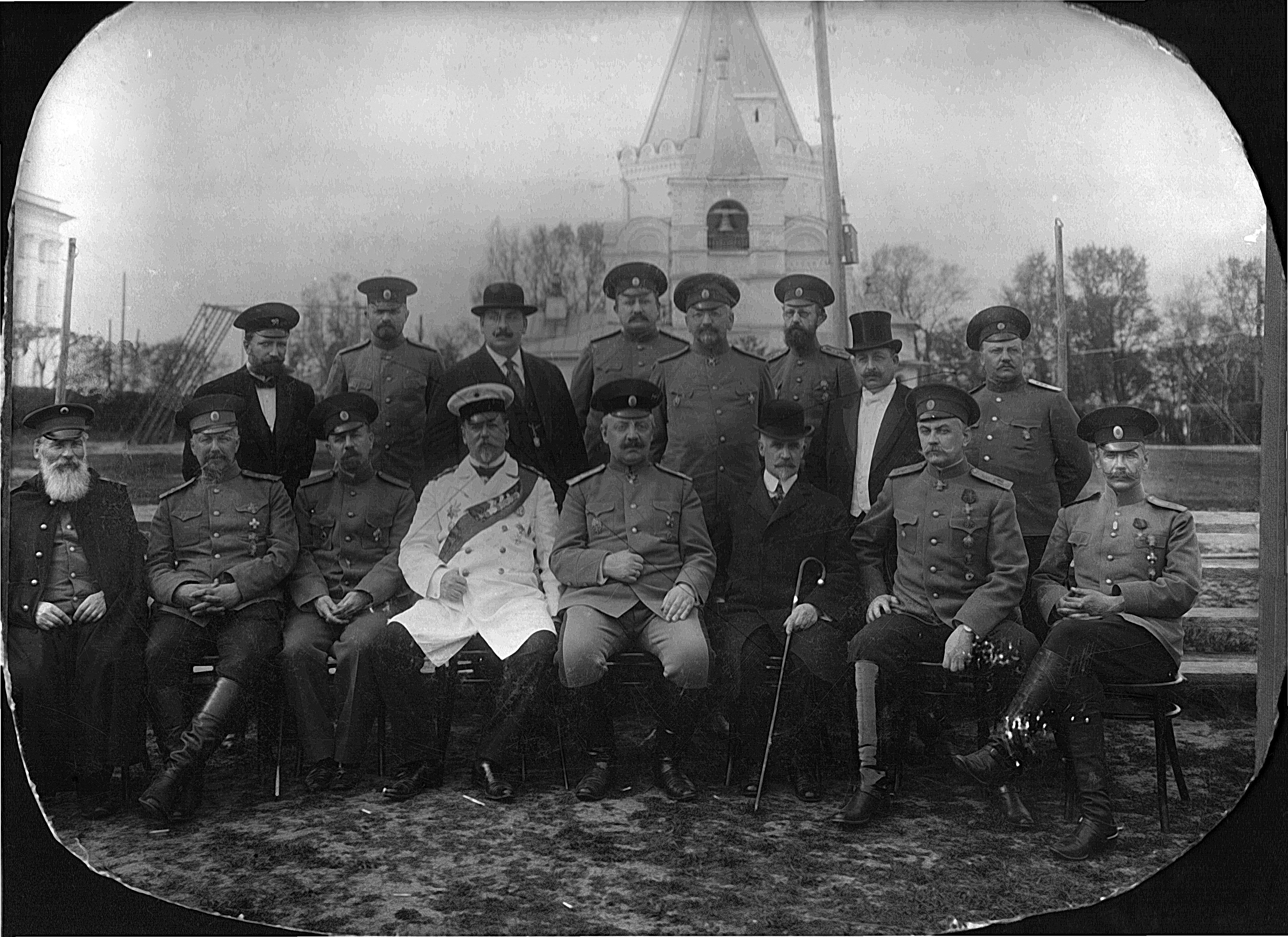 Групповой портрет военных и гражданских лиц на фоне церкви. Муром (?), 1910-е гг.