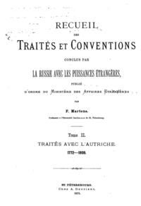 «Собрание Трактатов и Конвенций, заключенных Россией с иностранными державами» — публикация документов дипломатической истории России XVII-XX вв., изданная в 15 томах в 1874-1909 Ф. Ф. Мартенсом. «Собрание» включает документы о взаимоотношениях России с Австрией (и Австро-Венгрией) — т. 1-4; с Пруссией (Германией) — т. 5-8; с Англией — т. 9-12; с Францией — т. 13-15. Все документы воспроизведены на языке подлинника и даны в русском переводе. Каждому тому предпослано введение, многие тексты договоров снабжены комментариями. Собрание Мартенса являлось наиболее полной публикацией такого рода, многие соглашения и секретные статьи к ним были воспроизведены впервые.