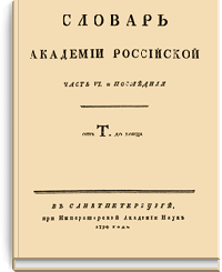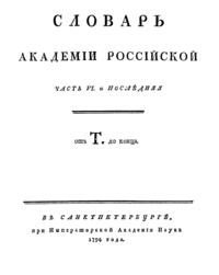 Знаменитый словарь Российской Академии, первый толковый словарь русского языка, содержащий 43 357 слов в 6 частях. Работа над словарём началась в 1783 году, и заняла 11 лет.