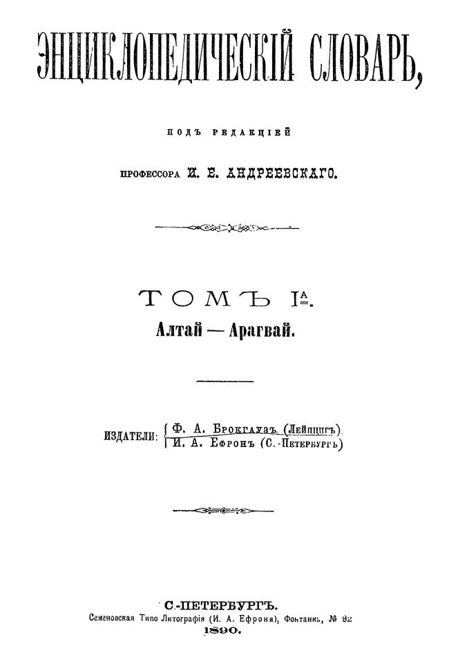 Самая крупная дореволюционная русская универсальная энциклопедия, выпущенная акционерным издательским обществом «Ф. А. Брокгауз — И. А. Ефрон». Состоит из 86 томов (82 основных и 4 дополнительных), выходивших в течение 1890-1907 годов. Первые 8 томов (до буквы «В») вышли под общей редакцией профессора И. Е. Андреевского и в основном содержали переводы на русский язык статей знаменитой немецкой энциклопедии Брокгауза «Konversations Lexikon».