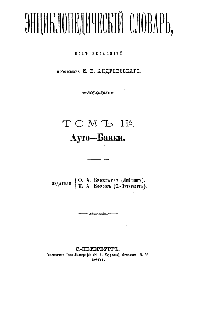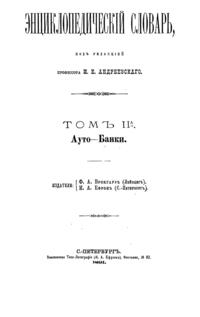 Самая крупная дореволюционная русская универсальная энциклопедия, выпущенная акционерным издательским обществом «Ф. А. Брокгауз — И. А. Ефрон». Состоит из 86 томов (82 основных и 4 дополнительных), выходивших в течение 1890-1907 годов. Первые 8 томов (до буквы «В») вышли под общей редакцией профессора И. Е. Андреевского и в основном содержали переводы на русский язык статей знаменитой немецкой энциклопедии Брокгауза «Konversations Lexikon».