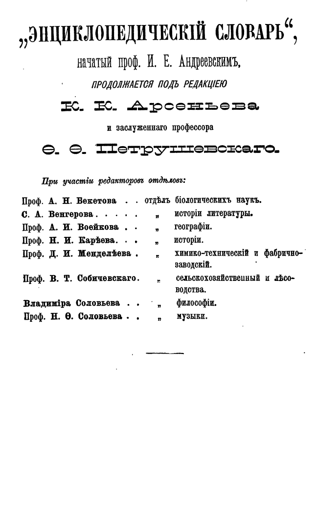 После кончины Андреевского новая редакция во главе с К. К. Арсеньевым и Ф. Ф. Петрушевским значительно увеличила число оригинальных статей и привлекла к сотрудничеству широкий круг общественно-политических деятелей либерального толка (от П. Н. Милюкова, В. И. Герье, Н. И. Кареева до легальных марксистов П. Б. Струве и М. И. Туган-Барановского, раздел философии вел крупнейший русский религиозный философ Вл. С. Соловьев), а также таких крупнейших ученых как Д. И. Менделеев, А. И. Бекетов, А. И. Воейков, Д. И. Анучин, Ю. М. Шокальский, Н. М. Книпович, А. О. Ковалевский, А. И. Советов, В. С. Соловьев и др.