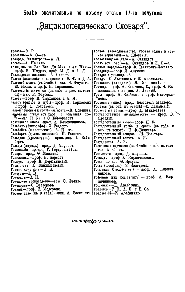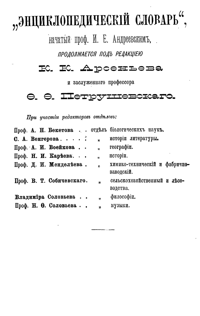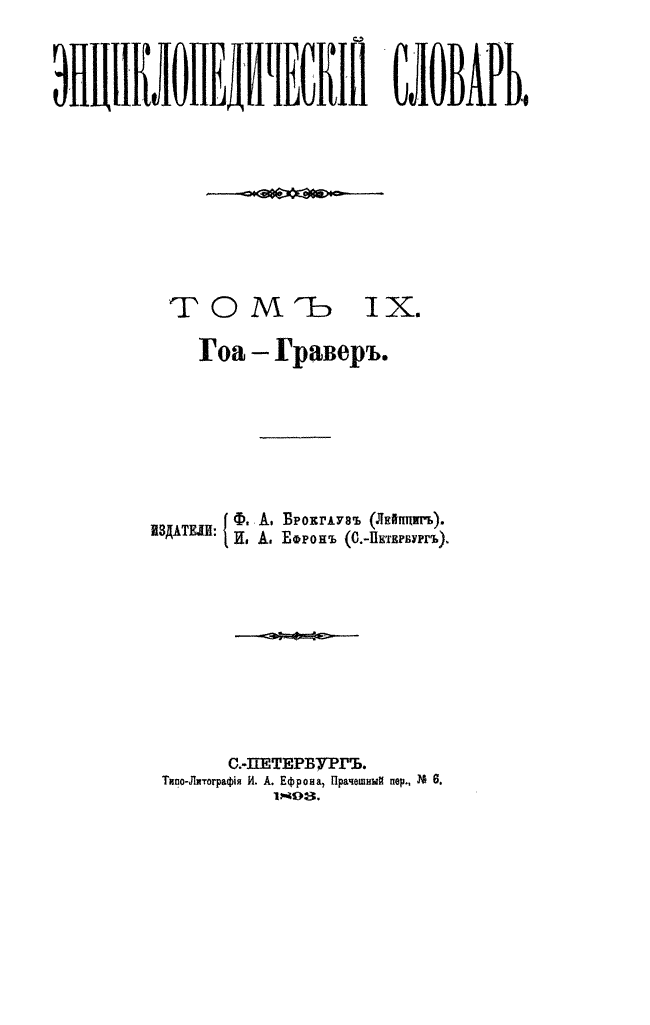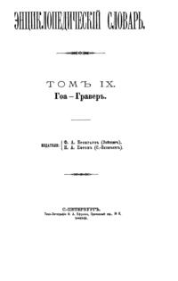 Самая крупная дореволюционная русская универсальная энциклопедия, выпущенная акционерным издательским обществом «Ф. А. Брокгауз — И. А. Ефрон». Состоит из 86 томов (82 основных и 4 дополнительных), выходивших в течение 1890-1907 годов. Первые 8 томов (до буквы «В») вышли под общей редакцией профессора И. Е. Андреевского и в основном содержали переводы на русский язык статей знаменитой немецкой энциклопедии Брокгауза «Konversations Lexikon».