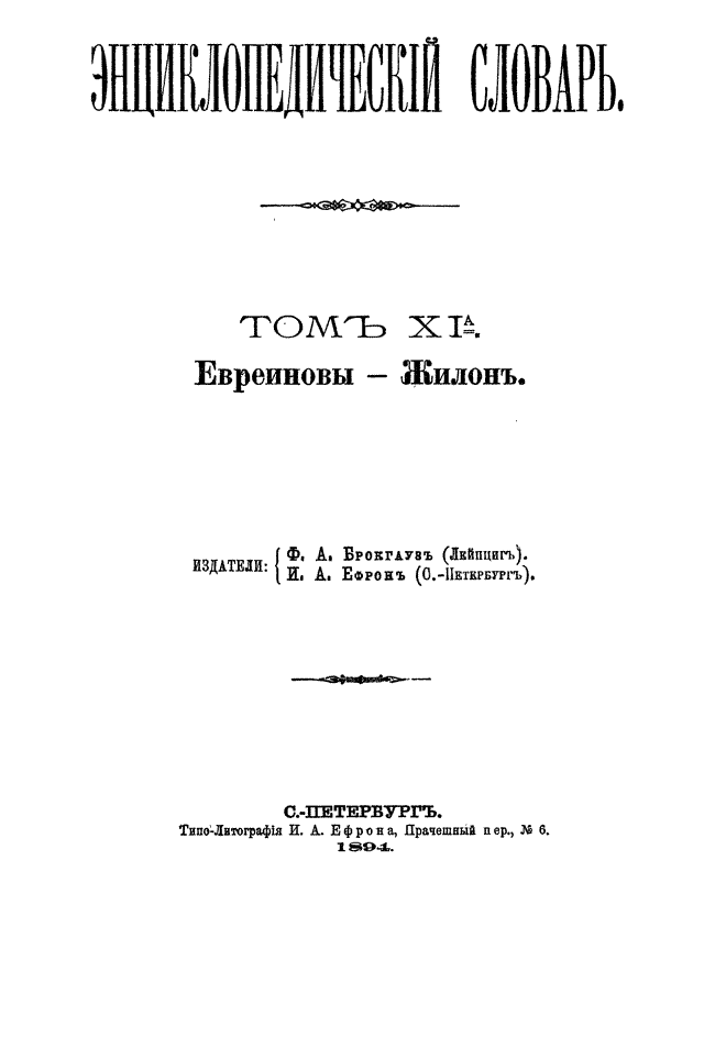 Самая крупная дореволюционная русская универсальная энциклопедия, выпущенная акционерным издательским обществом «Ф. А. Брокгауз — И. А. Ефрон». Состоит из 86 томов (82 основных и 4 дополнительных), выходивших в течение 1890-1907 годов. Первые 8 томов (до буквы «В») вышли под общей редакцией профессора И. Е. Андреевского и в основном содержали переводы на русский язык статей знаменитой немецкой энциклопедии Брокгауза «Konversations Lexikon».