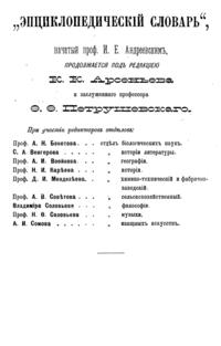 Самая крупная дореволюционная русская универсальная энциклопедия, выпущенная акционерным издательским обществом «Ф. А. Брокгауз — И. А. Ефрон». Состоит из 86 томов (82 основных и 4 дополнительных), выходивших в течение 1890-1907 годов. Первые 8 томов (до буквы «В») вышли под общей редакцией профессора И. Е. Андреевского и в основном содержали переводы на русский язык статей знаменитой немецкой энциклопедии Брокгауза «Konversations Lexikon».