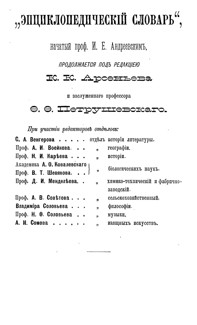 После кончины Андреевского новая редакция во главе с К. К. Арсеньевым и Ф. Ф. Петрушевским значительно увеличила число оригинальных статей и привлекла к сотрудничеству широкий круг общественно-политических деятелей либерального толка (от П. Н. Милюкова, В. И. Герье, Н. И. Кареева до легальных марксистов П. Б. Струве и М. И. Туган-Барановского, раздел философии вел крупнейший русский религиозный философ Вл. С. Соловьев), а также таких крупнейших ученых как Д. И. Менделеев, А. И. Бекетов, А. И. Воейков, Д. И. Анучин, Ю. М. Шокальский, Н. М. Книпович, А. О. Ковалевский, А. И. Советов, В. С. Соловьев и др.