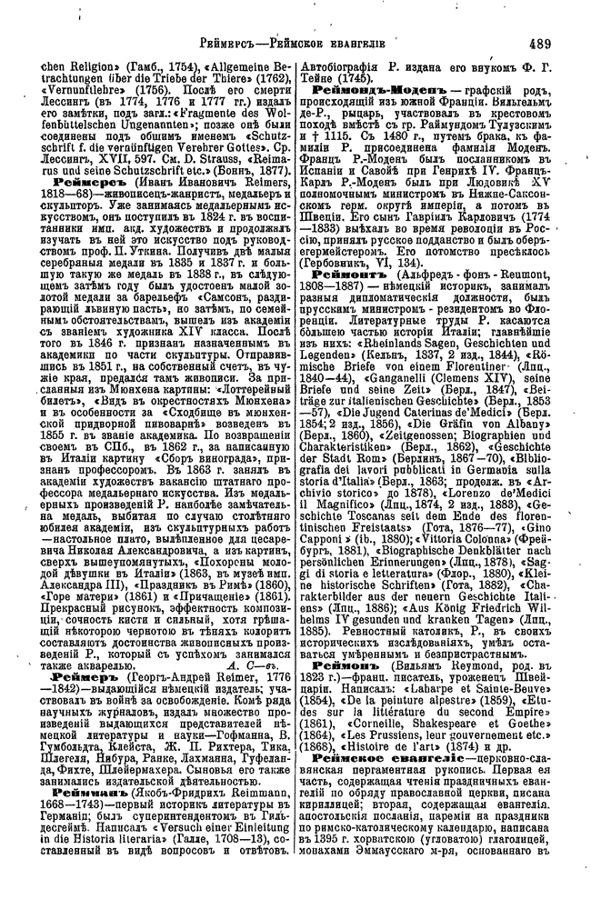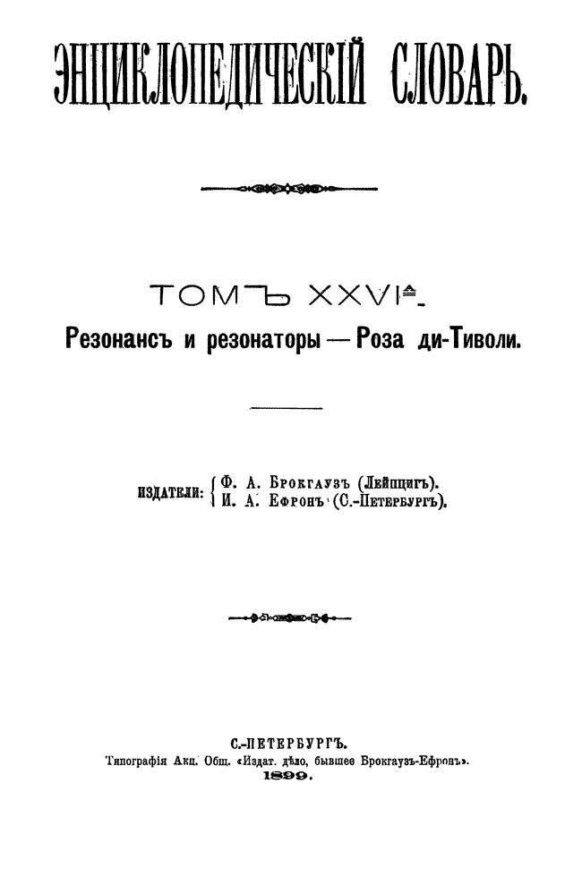 Самая крупная дореволюционная русская универсальная энциклопедия, выпущенная акционерным издательским обществом «Ф. А. Брокгауз — И. А. Ефрон». Состоит из 86 томов (82 основных и 4 дополнительных), выходивших в течение 1890-1907 годов. Первые 8 томов (до буквы «В») вышли под общей редакцией профессора И. Е. Андреевского и в основном содержали переводы на русский язык статей знаменитой немецкой энциклопедии Брокгауза «Konversations Lexikon».
