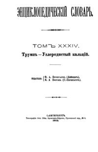 Самая крупная дореволюционная русская универсальная энциклопедия, выпущенная акционерным издательским обществом «Ф. А. Брокгауз — И. А. Ефрон». Состоит из 86 томов (82 основных и 4 дополнительных), выходивших в течение 1890-1907 годов. Первые 8 томов (до буквы «В») вышли под общей редакцией профессора И. Е. Андреевского и в основном содержали переводы на русский язык статей знаменитой немецкой энциклопедии Брокгауза «Konversations Lexikon».