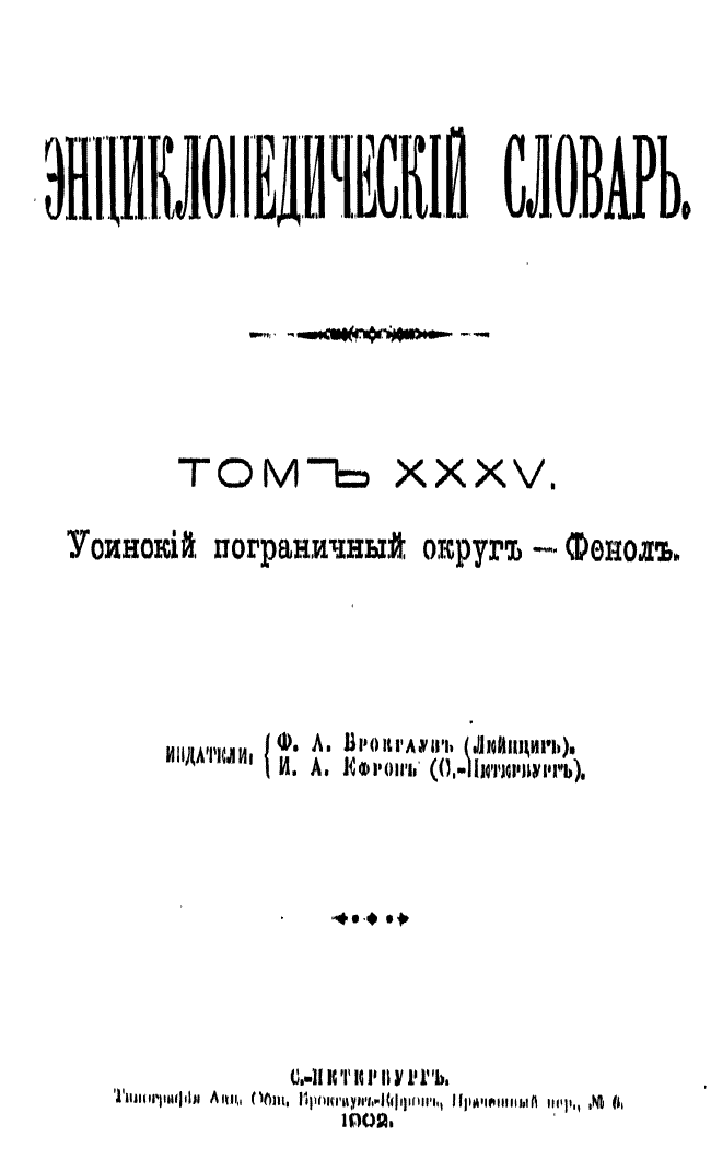 Самая крупная дореволюционная русская универсальная энциклопедия, выпущенная акционерным издательским обществом «Ф. А. Брокгауз — И. А. Ефрон». Состоит из 86 томов (82 основных и 4 дополнительных), выходивших в течение 1890-1907 годов. Первые 8 томов (до буквы «В») вышли под общей редакцией профессора И. Е. Андреевского и в основном содержали переводы на русский язык статей знаменитой немецкой энциклопедии Брокгауза «Konversations Lexikon».