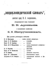 Самая крупная дореволюционная русская универсальная энциклопедия, выпущенная акционерным издательским обществом «Ф. А. Брокгауз — И. А. Ефрон». Состоит из 86 томов (82 основных и 4 дополнительных), выходивших в течение 1890-1907 годов. Первые 8 томов (до буквы «В») вышли под общей редакцией профессора И. Е. Андреевского и в основном содержали переводы на русский язык статей знаменитой немецкой энциклопедии Брокгауза «Konversations Lexikon».