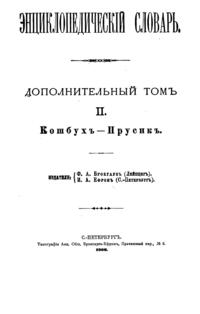 Самая крупная дореволюционная русская универсальная энциклопедия, выпущенная акционерным издательским обществом «Ф. А. Брокгауз — И. А. Ефрон». Состоит из 86 томов (82 основных и 4 дополнительных), выходивших в течение 1890-1907 годов. Первые 8 томов (до буквы «В») вышли под общей редакцией профессора И. Е. Андреевского и в основном содержали переводы на русский язык статей знаменитой немецкой энциклопедии Брокгауза «Konversations Lexikon».