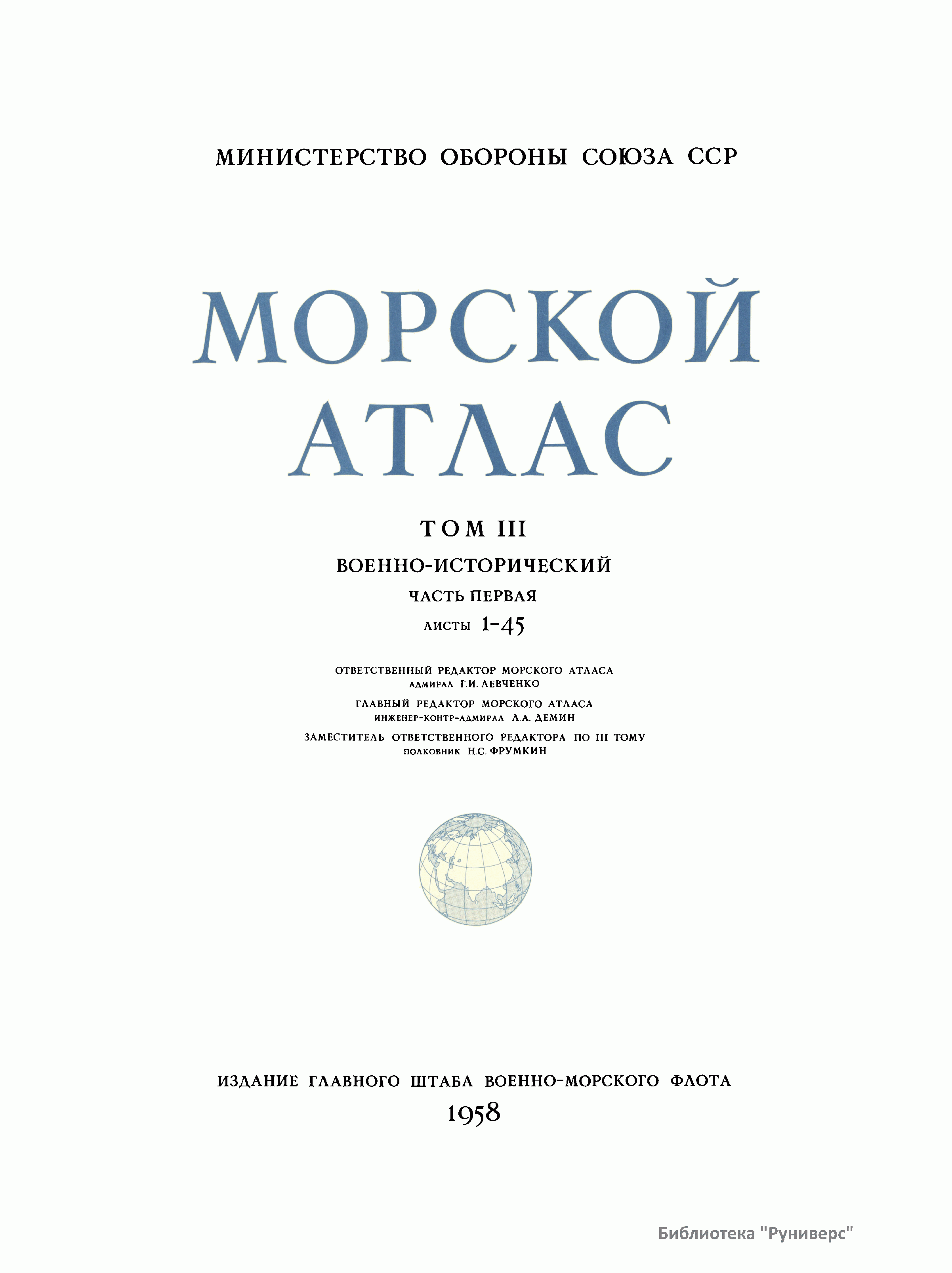 Морской атлас издается Главным штабом Военно-Морского Флота по постановлению Совета Министров Союза ССР.