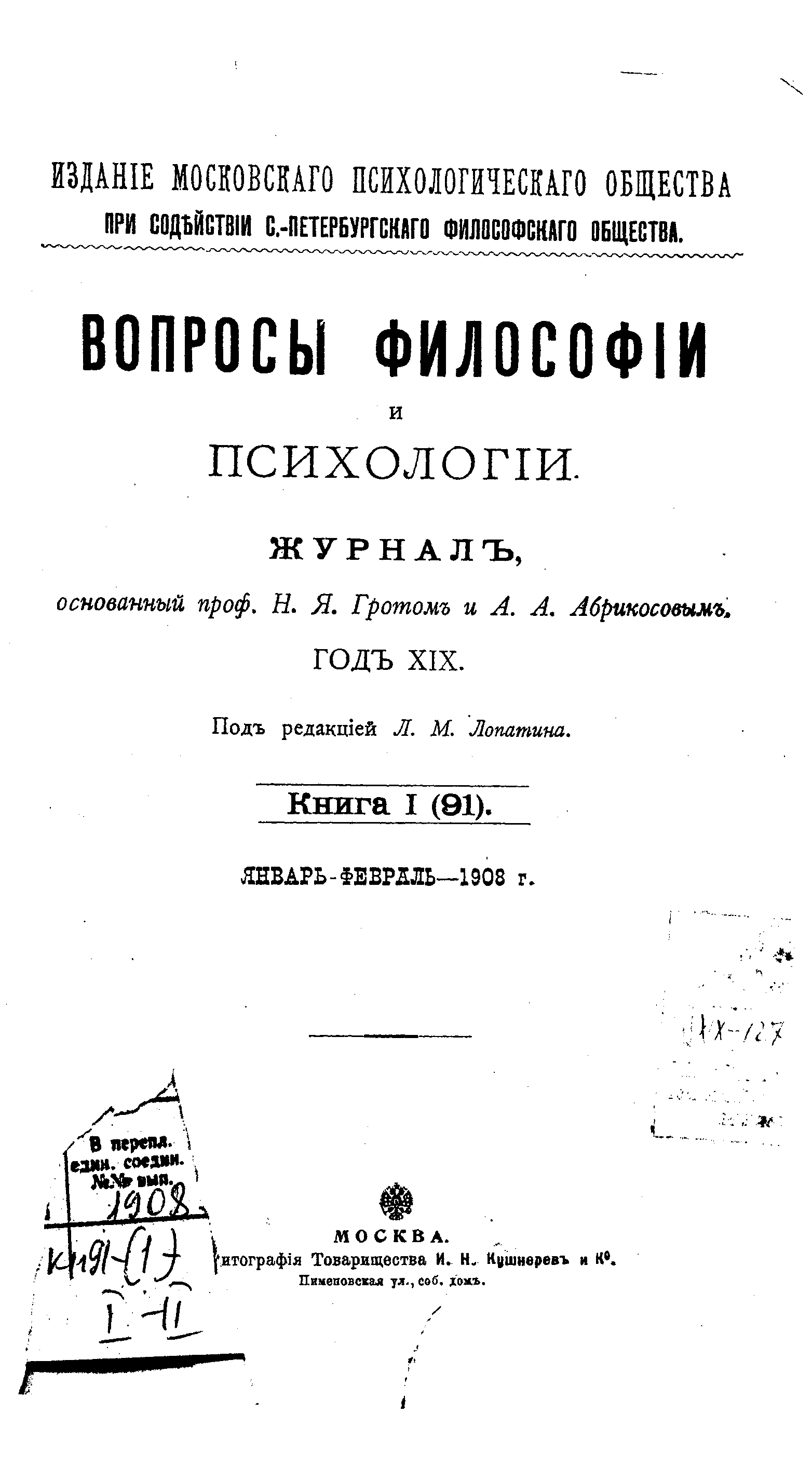 Вопросы философии и психологии. Книга 91.