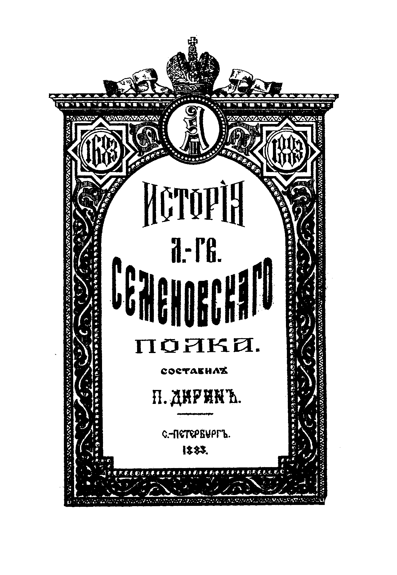 В 1883 г. в Санкт-Петербурге вышло в свет двухтомное издание, посвященное истории лейб-гвардии Семеновского полка, составленное поручиком Петром Дириным. Один из старейших полков российской армии — Семеновский — был сформирован в конце XVII века в подмосковном селе Семеновском из «потешных войск», созданных для забавы царевича Петра. В 1700 г. полк стал лейб-гвардейским, принимал участие во многих войнах, подавлении мятежей и дворцовых переворотах; в нем начинали военную службу генералиссимус А. В. Суворов-Рымникский, флотоводец А. Г. Орлов-Чесменский и фельдмаршал И. И. Дибич-Забалканский; его шефами были императоры и великие князья. Альбом иллюстраций состоит из двух листов текста и 38-ми отдельных листов монохромных изображений. На страницах альбома представлены портреты императоров, императриц, великих князей, командиров лейб-гвардии, рисунки форм обмундирования различных воинских чинов, а также иллюстрации крупнейших сражений Семеновского полка.