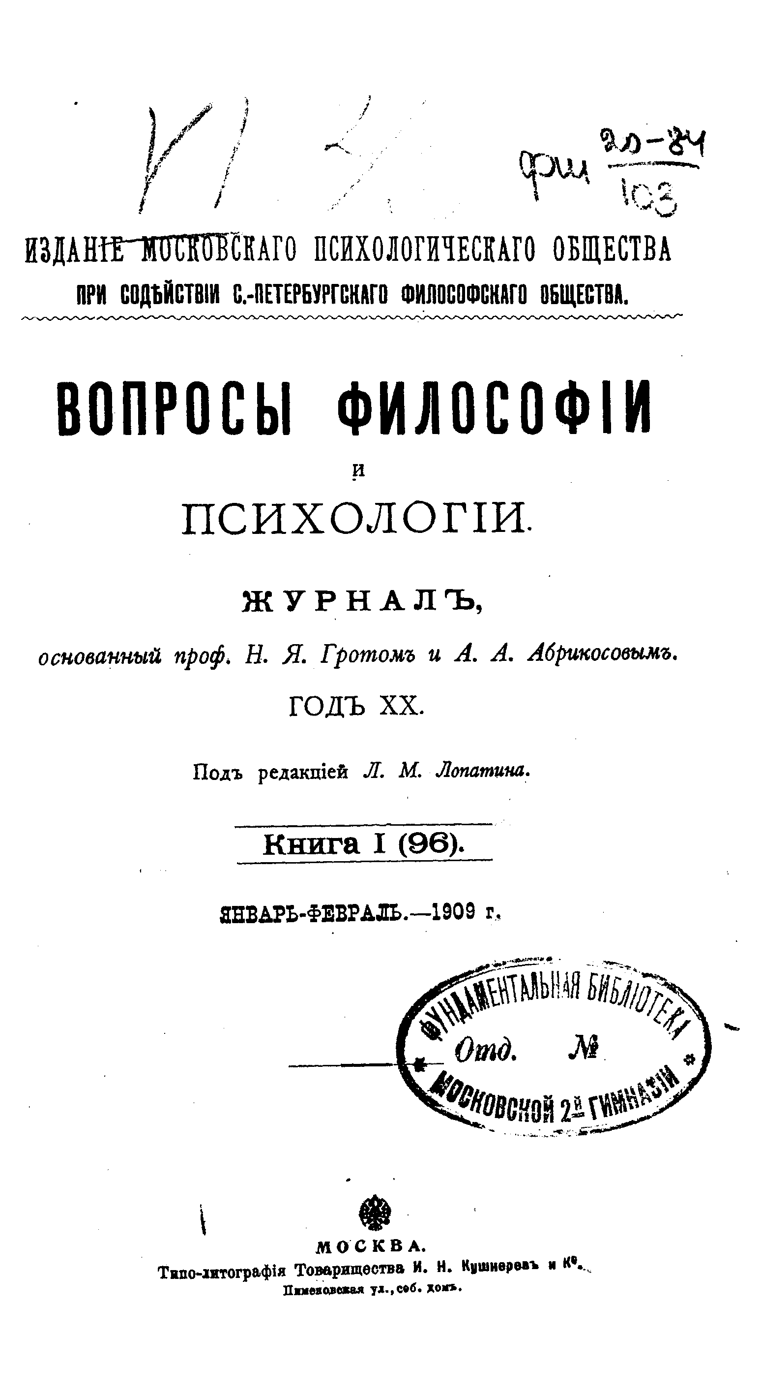 Вопросы философии и психологии. Книга 96.