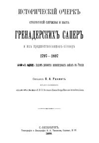 Историческiй очеркъ столѣтней службы и быта Гренадерскихъ саперъ и ихъ предшественниковъ-пiонеръ 1797-1897