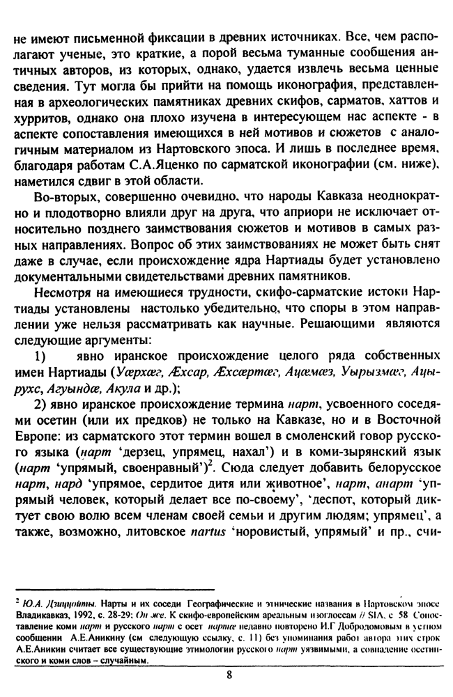В настоящую монографию включен раздел «Культурно-исторические предпосылки», взятый из другой готовящейся к печати монографии автора с рабочим названием «Страницы этнической истории Южной Осетии». Так как заимствование эпоса становится возможным только в результате теснейших межэтнических контактов, в этом разделе Дзиццойты поместил краткое изложение истории киммеро-скифо-сарматских племен в Закавказье и в Передней Азии.