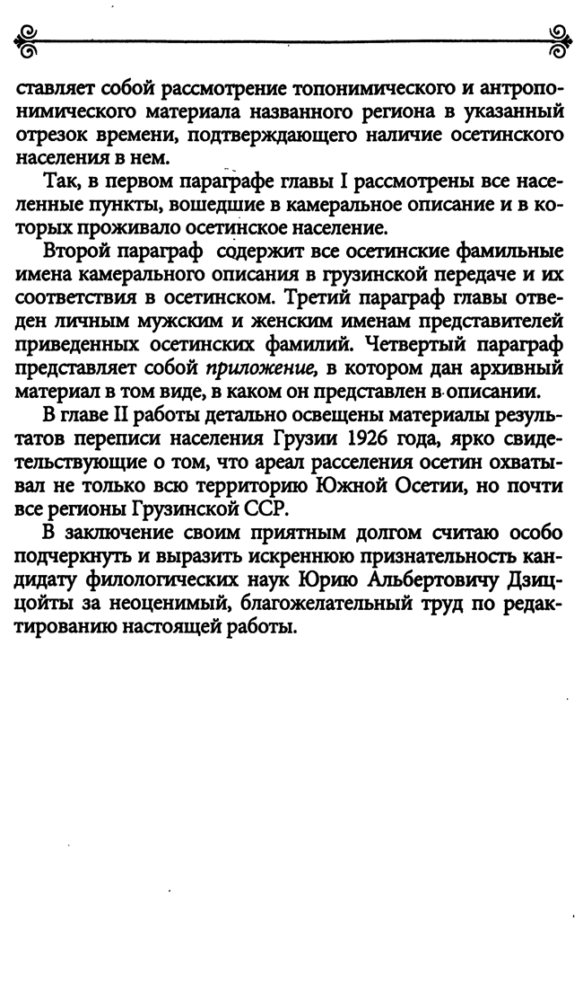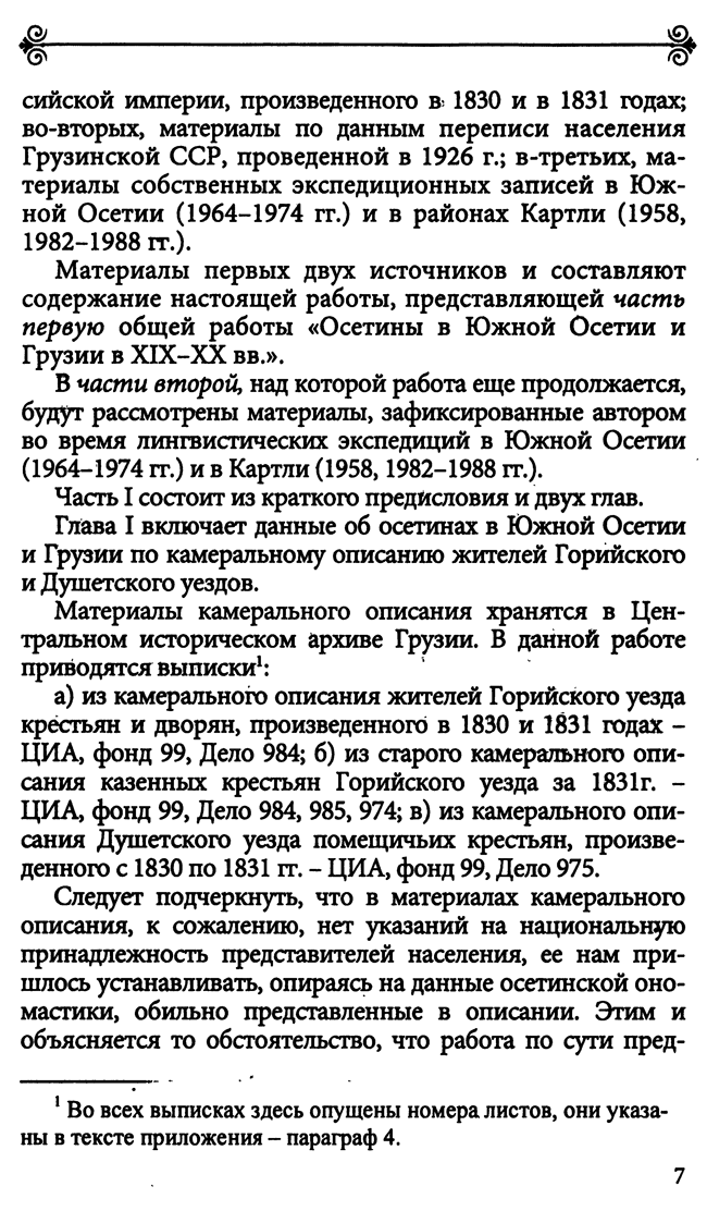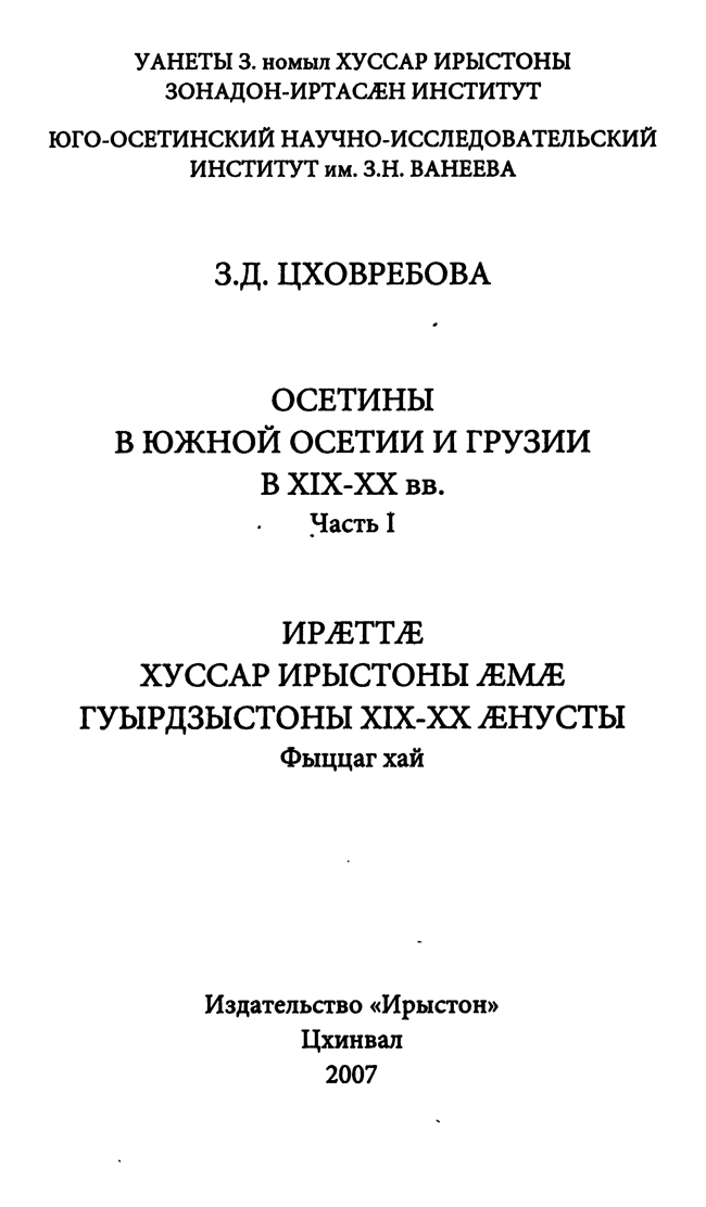 Книга содержит материал об осетинах в Южной Осетии и Грузии по камеральному описанию жителей бывших Горийского, Душетского уездов (1830-1831 гг.) и переписи населения Грузинской ССР 1926 г.