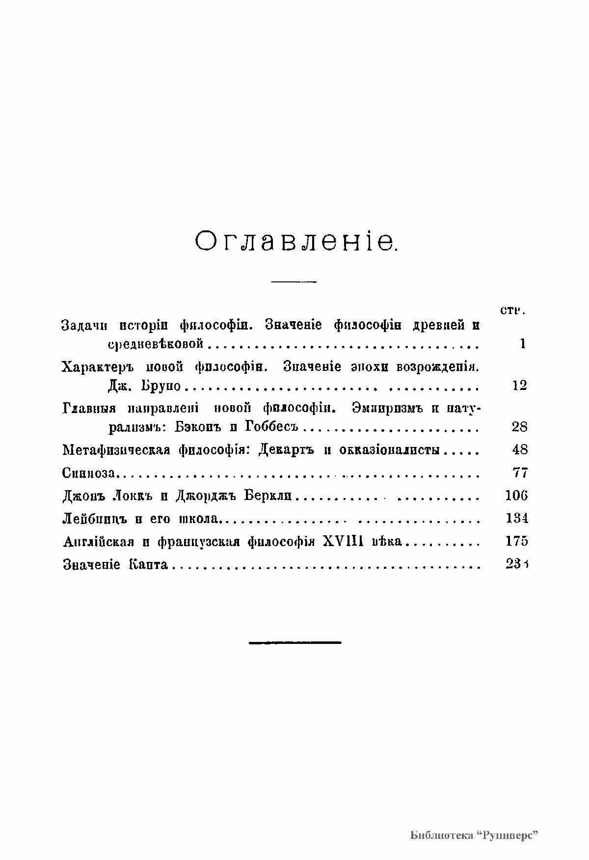 Книга известного отечественного философа и психолога Н.Я.Грота (1852-1899), состоит из очерков, которые охватывают существенные моменты развития европейской философии в течение XVII-XVIII веков. Во вступительном очерке излагаются задачи истории философии и рассматривается значение древней и средневековой философии для ее дальнейшего развития. С целью выяснения условий возникновения, задач и общего смысла новой философии автор обращается к философским движениям предшествующей ей эпохи Возрождения и кратко рассматривает жизненный путь и учение крупнейшего ее представителя Дж.Бруно, заложившего важнейшие основания всех главных философских систем XVII века. Основная часть книги посвящена изложению взглядов и теорий наиболее выдающихся мыслителей нового времени - Ф.Бэкона, Т.Гоббса, Р.Декарта, Б.Спинозы, Дж.Локка, Дж.Беркли, Г.Лейбница; освещается развитие английской и французской философии XVIII века. Заключительный очерк посвящен рассмотрению значения философской системы И.Канта, ознаменовавшей собой переход от новой к новейшей философии.