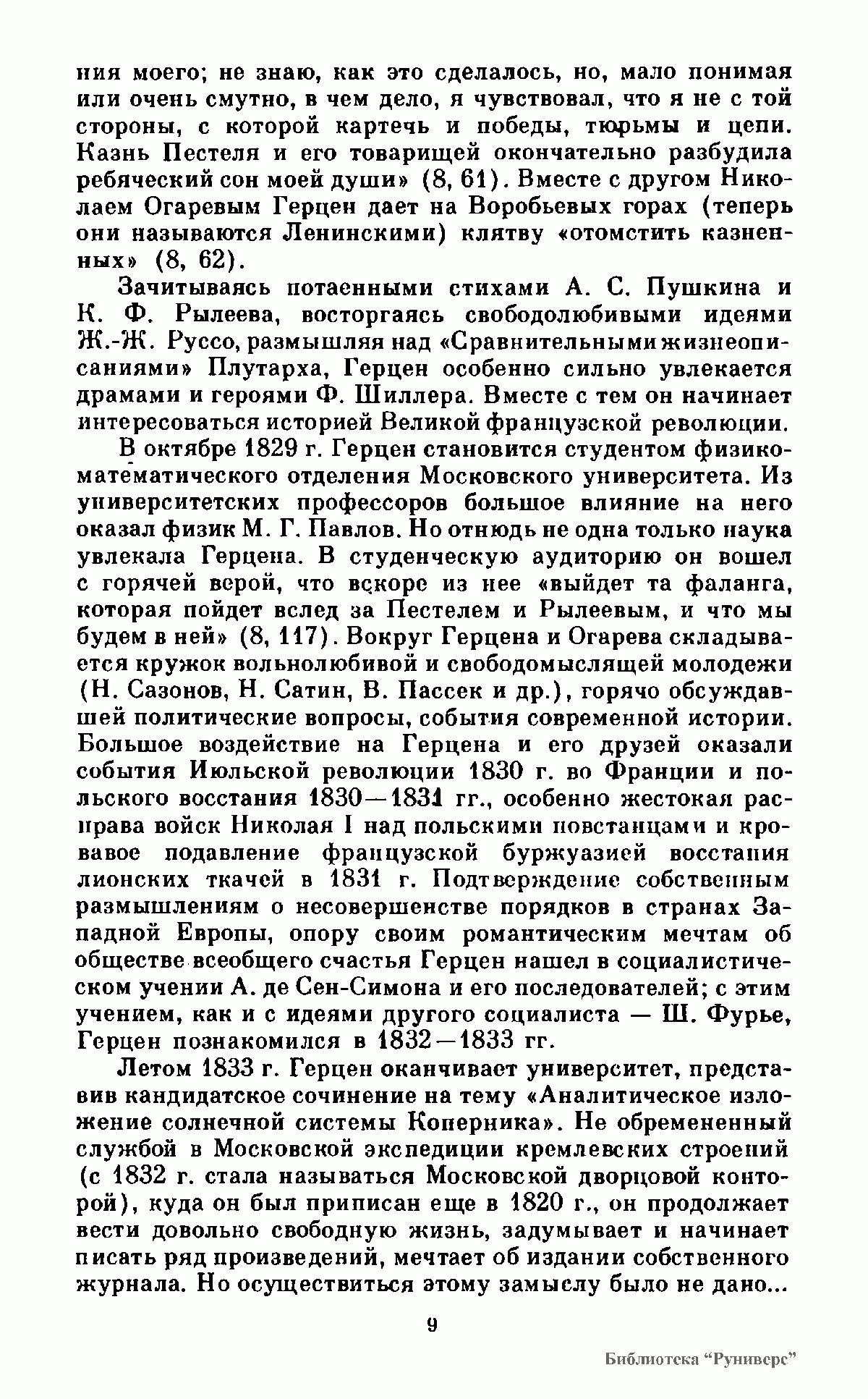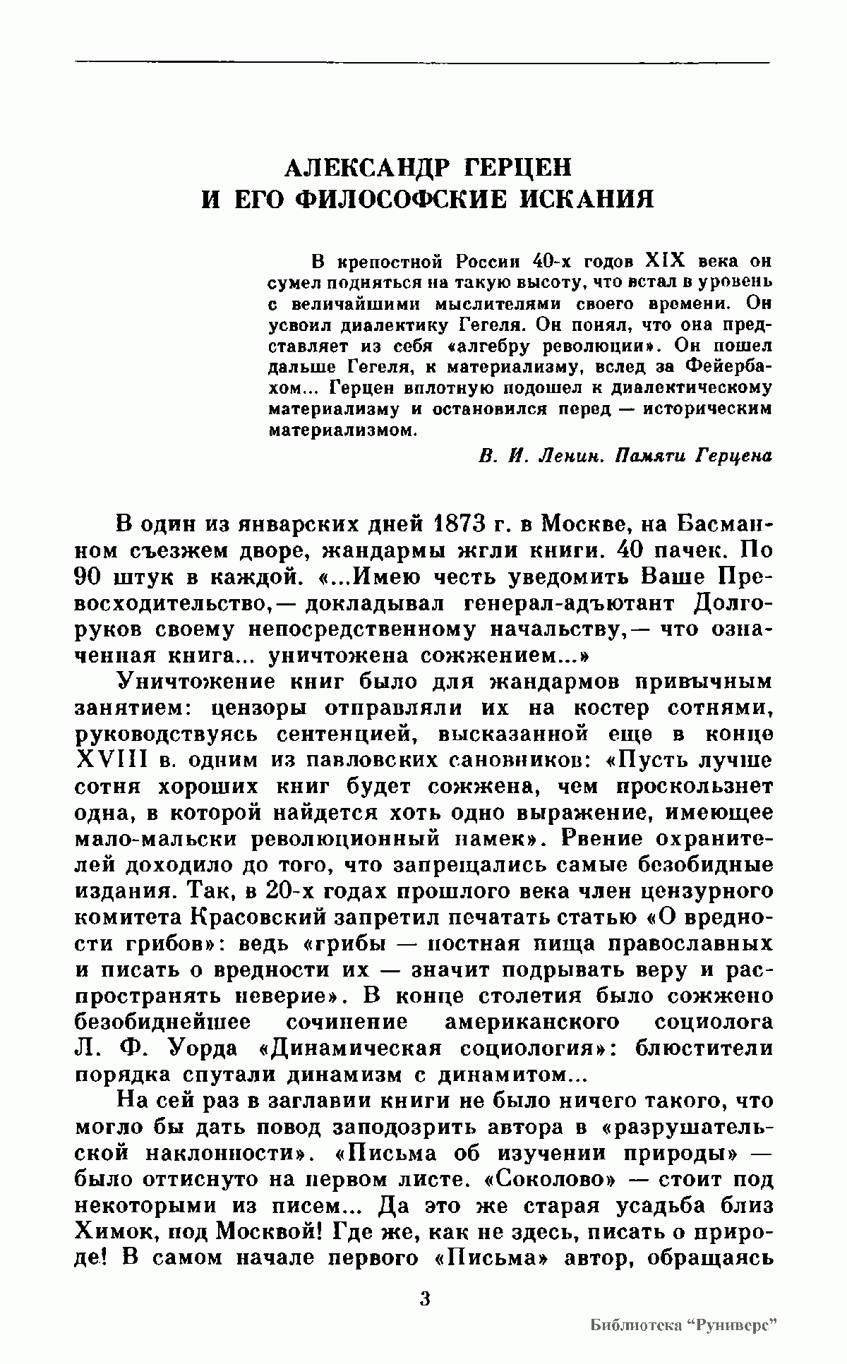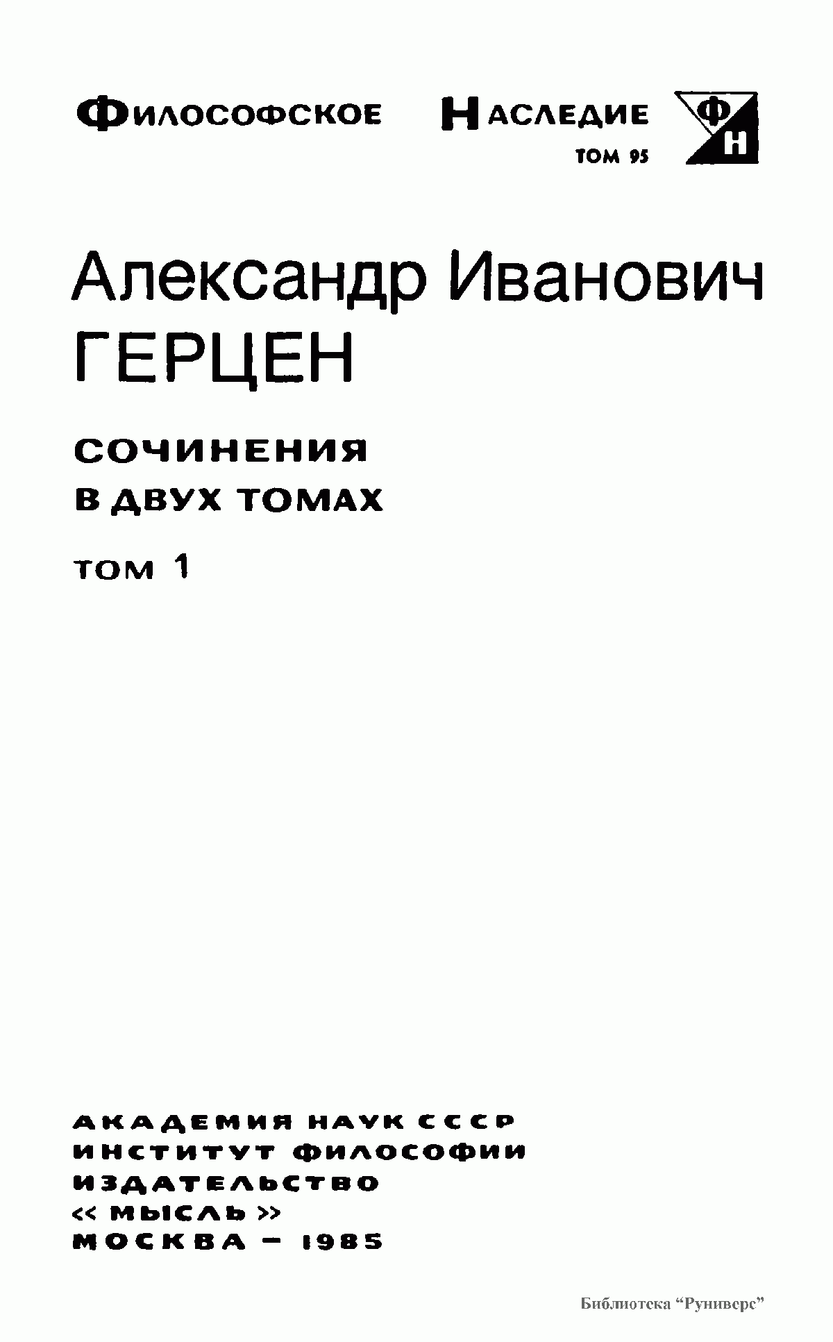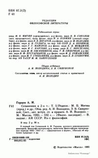В первый том Сочинений А. И. Герцена, русского революционного демократа, философа-материалиста, включены философские произведения периода 1832—1847 гг.— «Дилетантизм в науке», «Письма об изучении природы» и др. Во второй том Сочинений входят работы 1848—1870 гг.: «С того берега», «Русский народ и социализм», «Концы и начала» и другие.