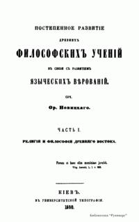 в "Пути Русского Богословия" отмечает, что Новицкий "пишет первую историю древней философии по-русски, — «Постепенное развитие древних философских учений в связи с развитием языческих верований» (четыре тома, 1860–1862). Написанная по источникам, эта книга и до сих пор сохраняет известную живость".
