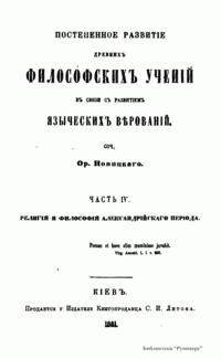 в "Пути Русского Богословия" отмечает, что Новицкий "пишет первую историю древней философии по-русски, — «Постепенное развитие древних философских учений в связи с развитием языческих верований» (четыре тома, 1860–1862). Написанная по источникам, эта книга и до сих пор сохраняет известную живость".
