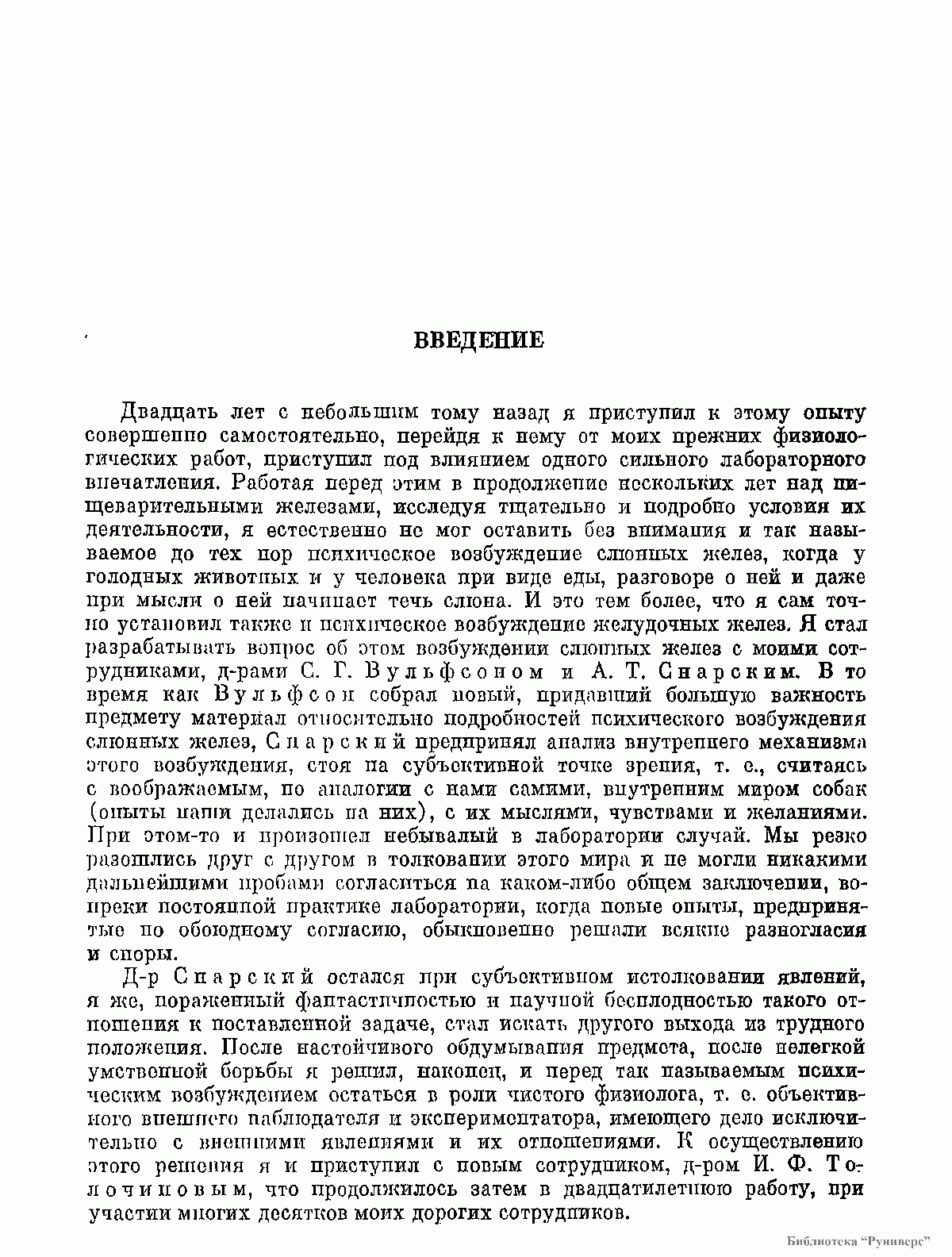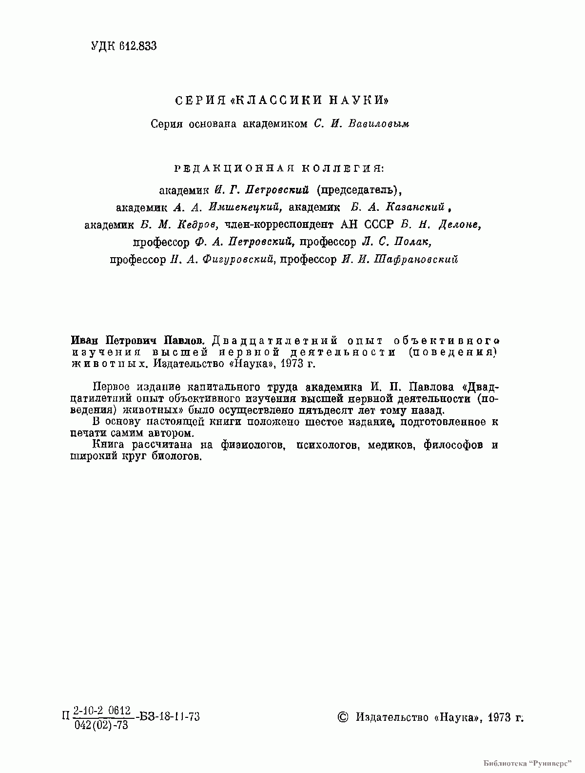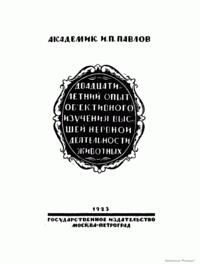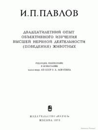 Книга Ивана Петровича Павлова с символическим названием «Двадцатилетний опыт объективного изучения высшей нервной деятельности (поведения) животных» в настоящем наиболее полном ее издании является своеобразной летописью всей, полной драматическими событиями истории зарождения и развития эпохального значения его исследований по физиологии большого мозга, всех этапов формирования, развития и совершенствования его великого материалистического учения о высшей нервной деятельности, отображает всю панораму его подвижнического труда и страстной борьбы за любимое научное детище. Вот почему нам представляется, что в известном отношении главным трудом Павлова, дающим более полное представление об его учении о высшей нервной деятельности, следует считать именно эту книгу.Первое издание этого капитального труда академика И. П. Павлова было осуществлено пятьдесят лет тому назад. Настоящее 10-е издание этой книги на русском языке, в основу которого положено шестое издание, подготовленное к печати самим автором, является по существу юбилейным, к тому же вдвойне юбилейным. В 1973 г. исполнилось не только пятьдесят лет со времени первого издания «Двадцатилетнего опыта» Павлова, но и семьдесят лет со времени его исторической речи на Международном медицинском конгрессе в Мадриде под названием «Экспериментальная психология и психопатология па животных», речи яркой, смелой, программной, возвещающей научный мир об официальном рождении великого учения о высшей нервной деятельности — одного из величайших достижений естествознания столетия.Книга рассчитана на физиологов, психологов, медиков, философов и широкий круг биологов.