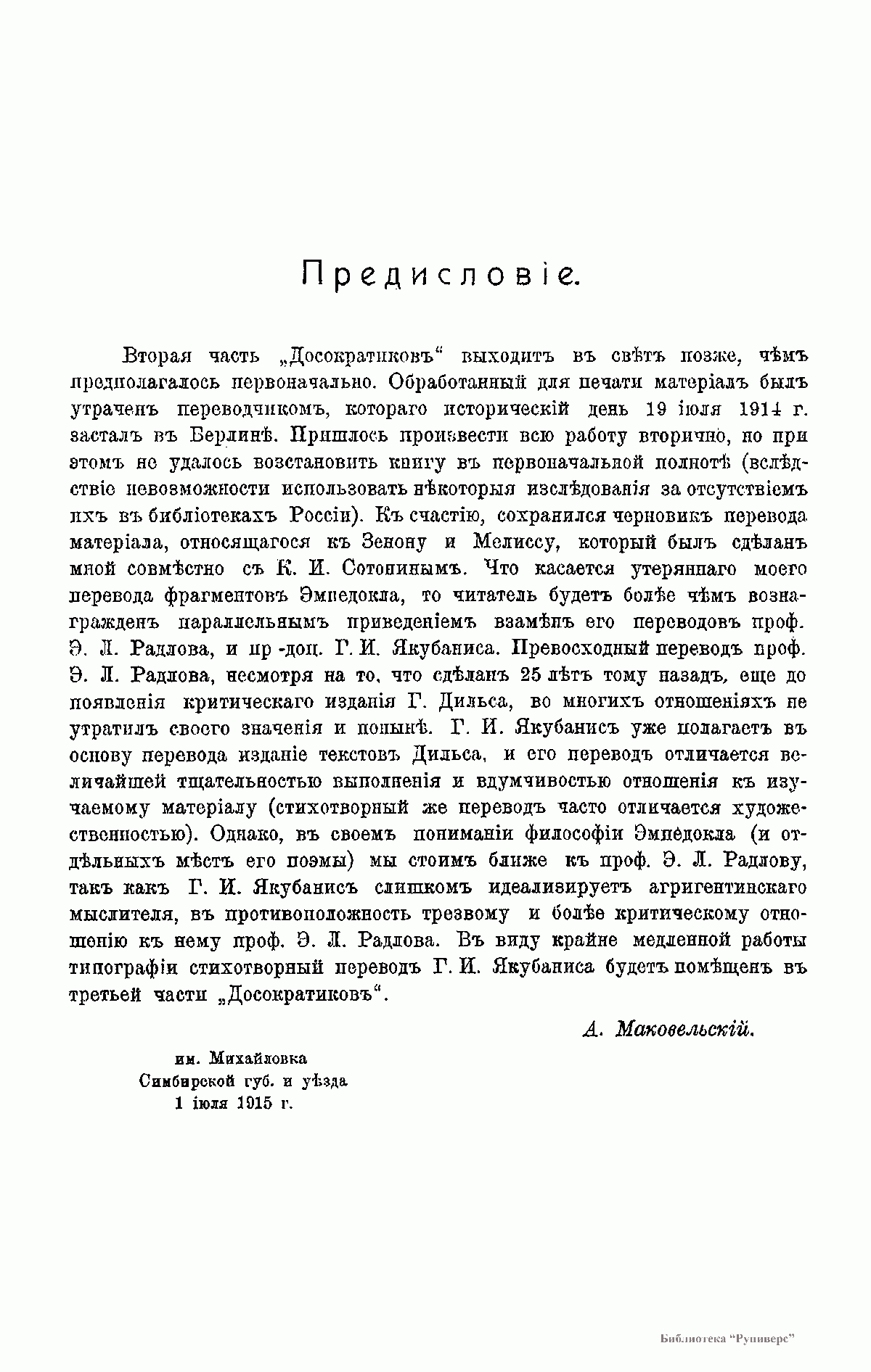 Досократики. Первые греческие мыслители в их творениях, в свидетельствах древности и в свете новейших исследований. Историко-критический обзор и перевод фрагментов, доксографического и биографического материала Александра Маковельского, приват-доцента Казанского Университета.